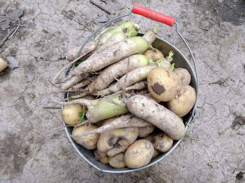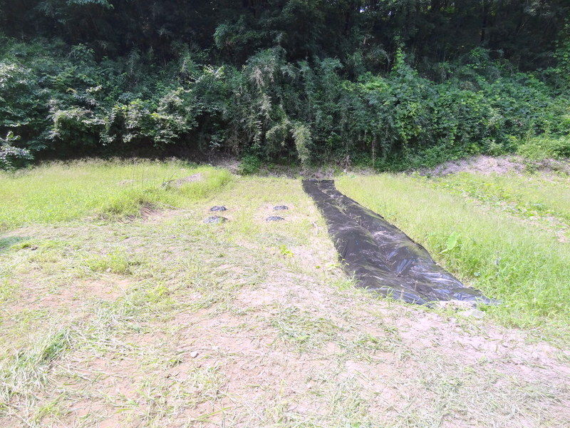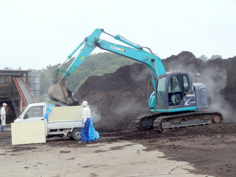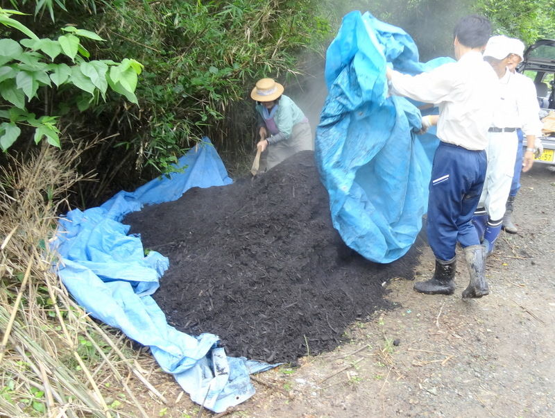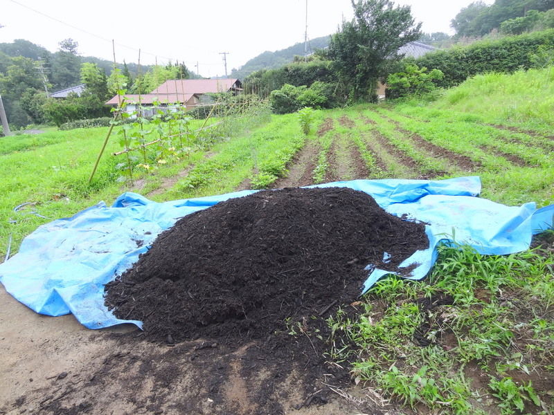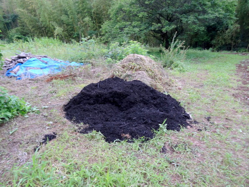 堆肥づくりに、田んぼの草、野菜の残渣(ざんさ)、ヌカをまぜてブルーシートをかけていますが、雨が降り、何日か放置して水分量の調整をしなかったため、臭っていたのでシートを外し、今日刈った草をフォークで混ぜました。