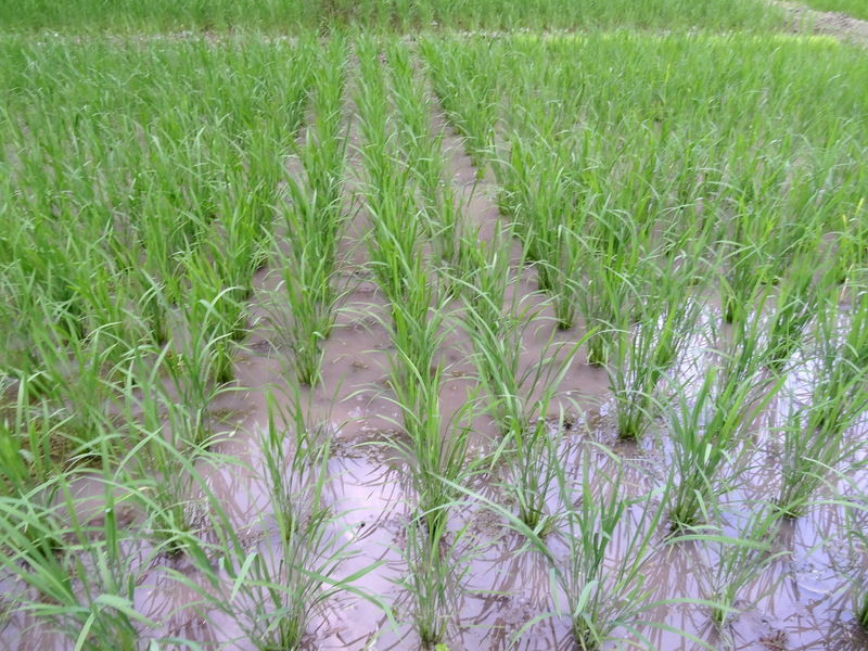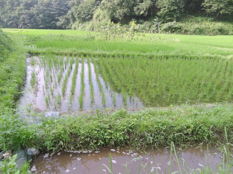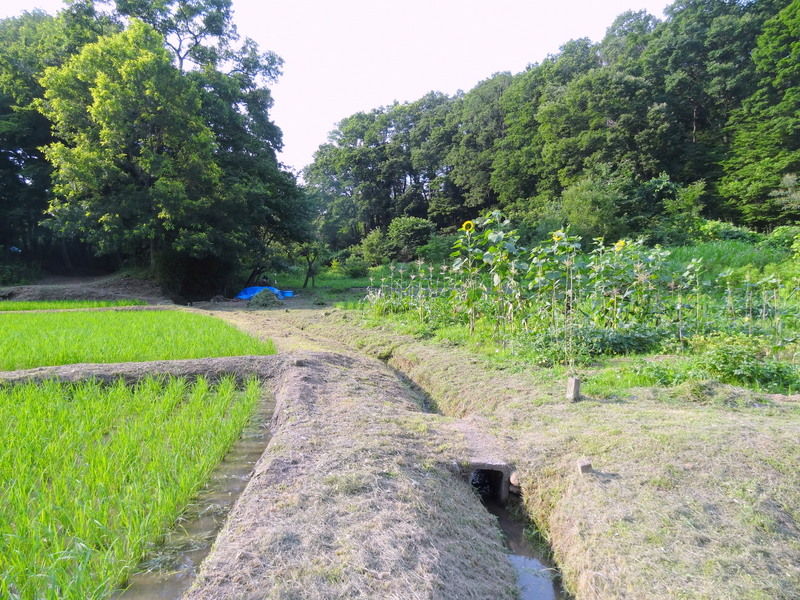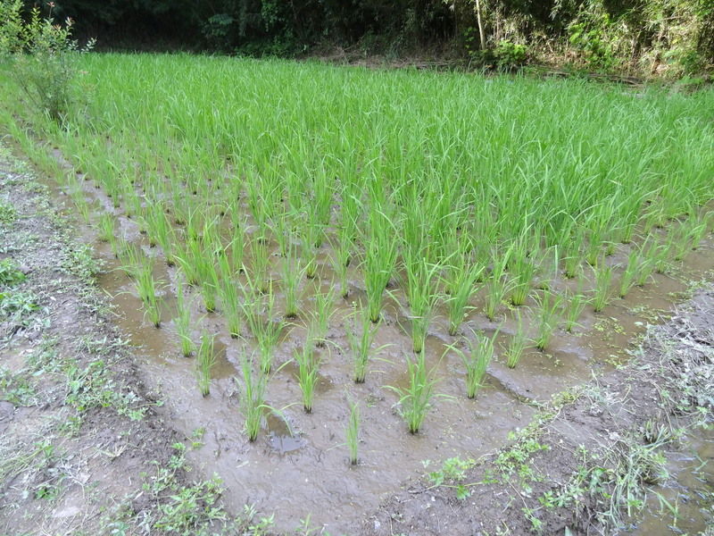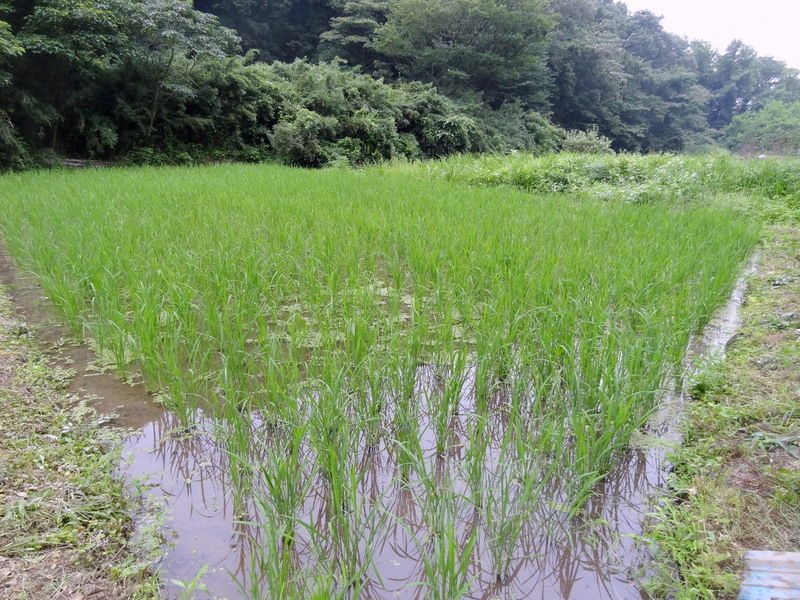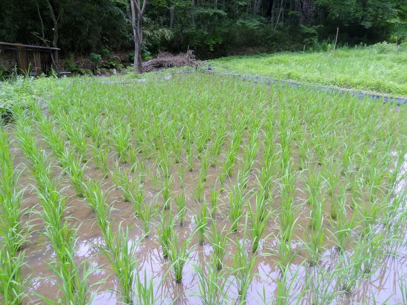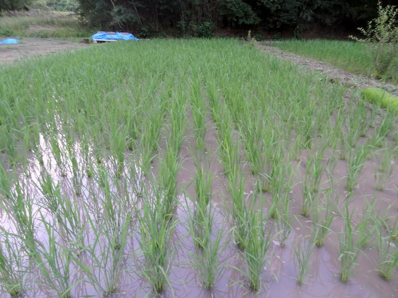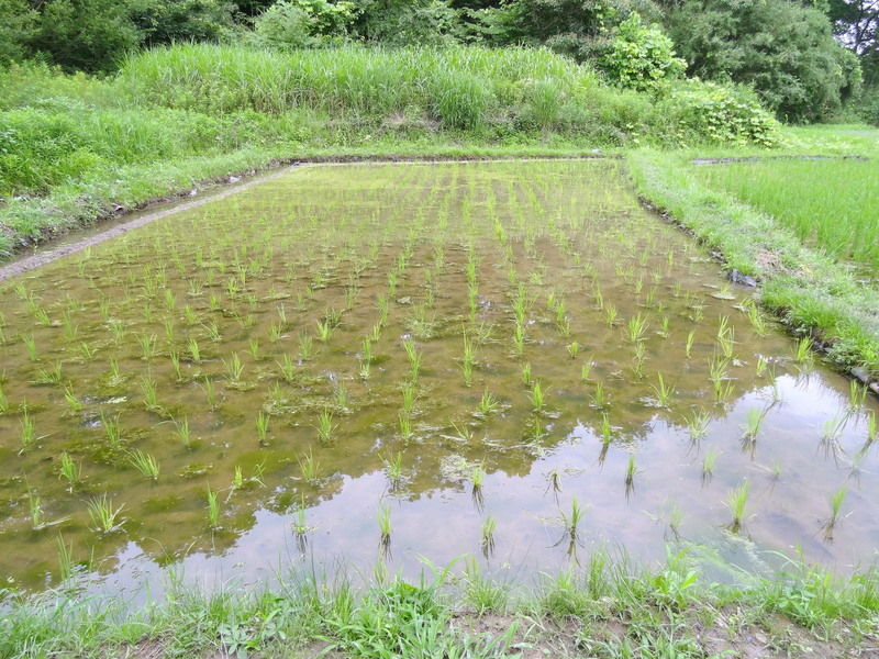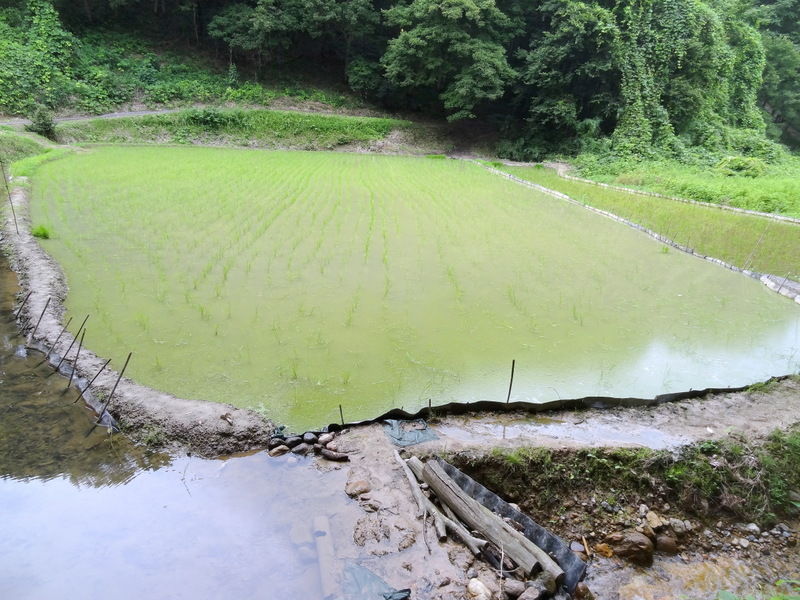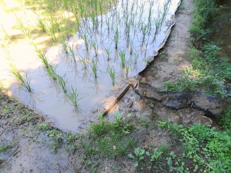 A地区の上の田んぼは、B地区の田んぼから3週間遅れて6月26日に田植えをしました。A地区・B地区の3枚の田んぼの中では一番発育がおくれていますが、田んぼの水面で目立つのは、藻類のアオミドロ(去年はシャジクモ?)で、田んぼの水温の低さを示しています(下の田んぼウキクサ)。水温の低さが生育の遅れに影響しています。今年の収穫が終わったら、ひょうたん池との間の畦を巾広くしっかりと築きなおし、水漏れしないように作り直すことも課題です。
