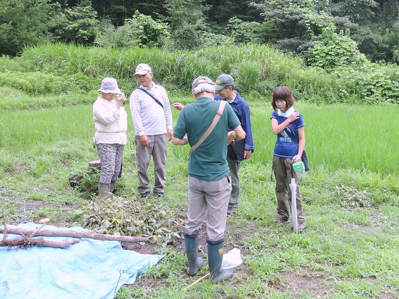 岩殿A地区で子育て支援課の市内中学生の田んぼの草取りと生きもの観察会を実施しました。中学生は鋸鎌(のこぎりかま)で畦の草刈りをし、刈り取った草を集めました。