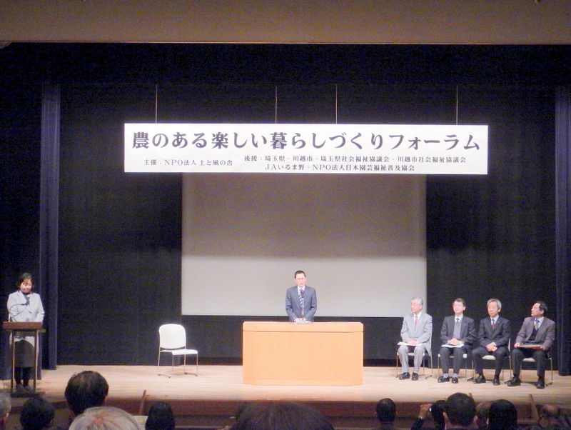 午後、川越西文化会館で開かれたNPO法人土と風の舎主催『農のある楽しい暮らしづくりフォーラム ~誰もが農のある暮らしを楽しめるように~ 』に参加しました。昨年12月5日に参加したECOM出版記念パーティ&望年会で参加者からビラを貰って申込んでおいた催しです。