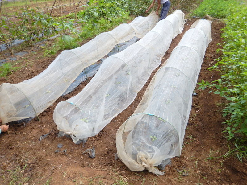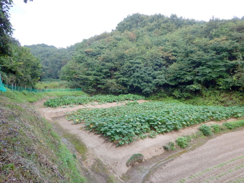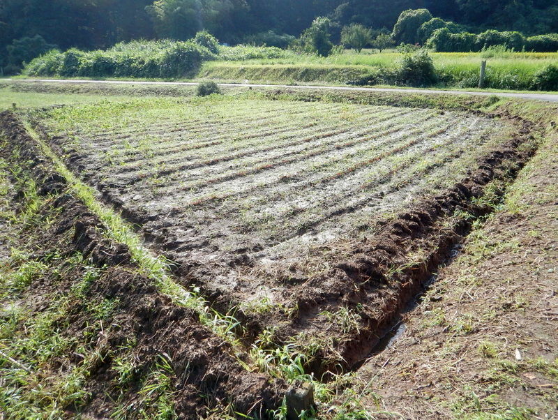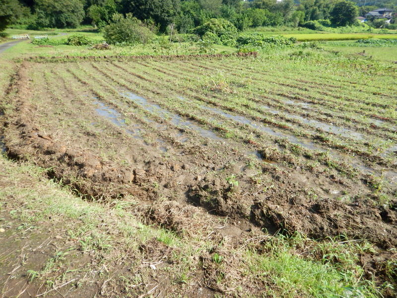 9時頃の青木ノ入の畑です。9月4日に種をまいて、大雨で水浸しになっていたので、豪雨と水没の影響を心配していました。出芽はしていますが育つのかどうか、欠けているところもチラホラ目につきます(再度の種まきが必要か)。地面に水がまだ残っている部分があるので、追加の水抜き対策(畝間の作切り)が必要です。