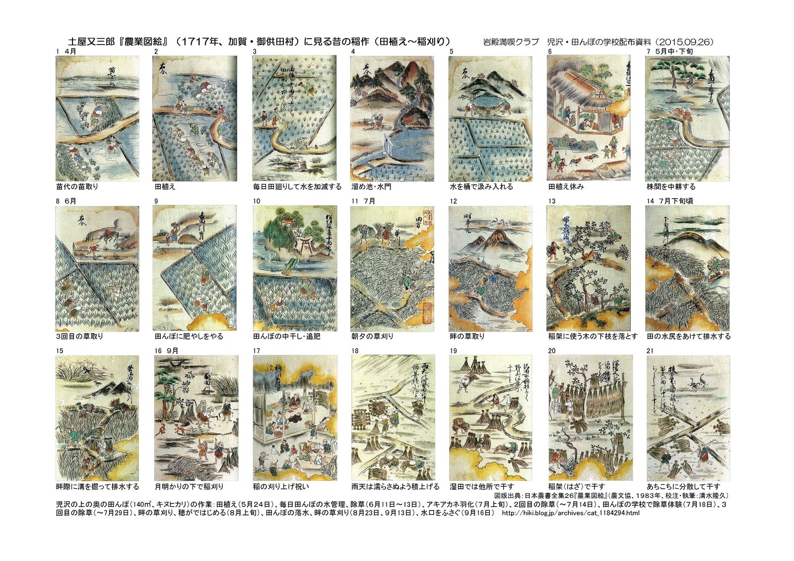 児沢の上の奥の田んぼ(140㎡、キヌヒカリ)の田植え~稲刈りまでの作業は、田植え(5月24日)、毎日田んぼの水管理、除草(6月11日~13日)、アキアカネ羽化(7月上旬)、2回目の除草(~7月14日)、田んぼの学校で除草体験(7月18日)、3回目の除草(~7月29日)、畔の草刈り、穂がではじめる(8月上旬)、田んぼの落水、畔の草刈り(8月23日、9月13日)、水口をふさぐ(9月16日)、稲刈り(9月26日)でした。土屋又三郎『農業図絵』(1717年、加賀・御供田村)に見る昔の稲作(田植え~稲刈り)と題した資料を参加者に配りました。