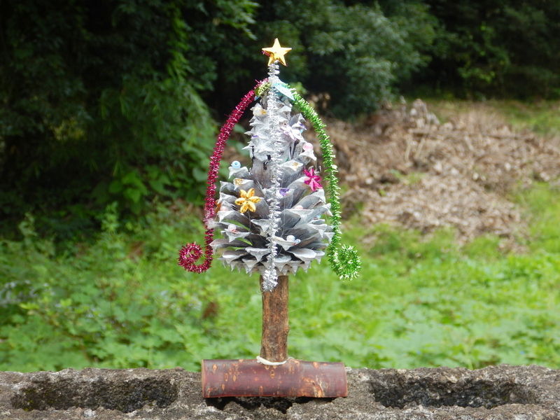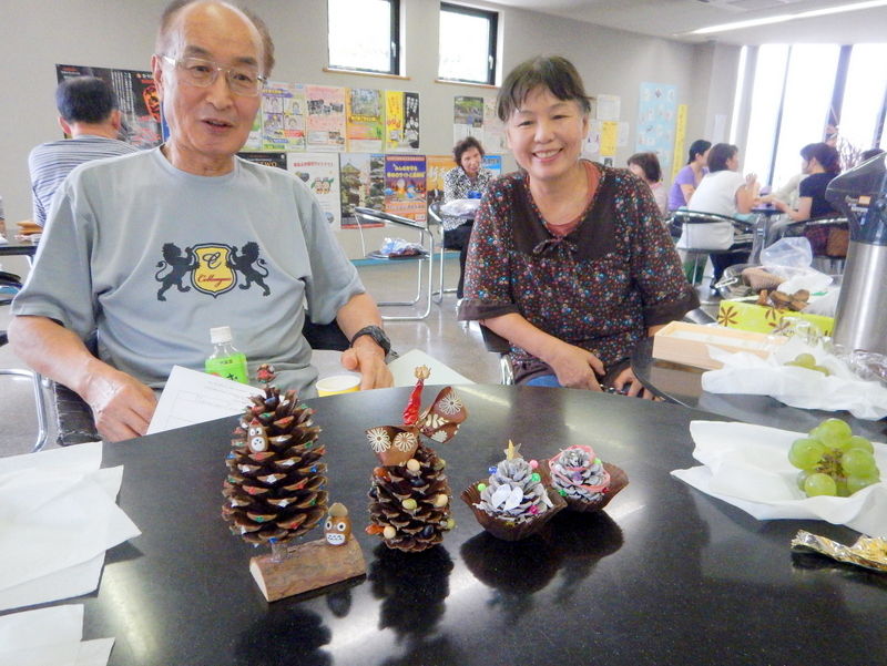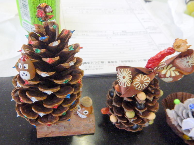 金子さん、澤田さん、細川さんがツリーの見本と手持ちの材料と道具を持ってきてくれたので、松ボックリにつける飾りの小物や工具が足りているかどうかチェックし、当日は、金子さん、澤田さん、細川さん、渡部さんの4名を担当グループとしてクラフトづくりをすすめていくことにしました。