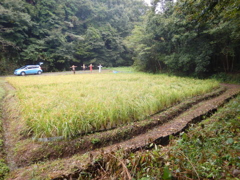 児沢の上の奥の田んぼの稲刈りをしました。TOTO社員の皆さんとスタッフ10人です。昨日からの雨で田んぼの泥濘(ぬかるみ)に長靴がはまると抜け出すのが大変でした。11時半頃、作業が終わりました。その頃はお日様もでていて夏に戻った様な暑さでした。