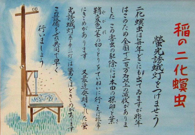 ニカメイチュウは、毎年どこにでも出ていますが、昨年はこのため全国で200万石以上の減収がありました。この害虫の駆除には、本田の採卵と葉鞘変色茎(さやがれ)の切り取りをていねいに行えば、非常に効き目があります。 また、最近発明された蛍光誘蛾灯(5町歩に1灯)は、驚くほど効き目があります。この設備をぜひ共同で早く行いましょう。[1953年(昭和28)、岩手県の岩谷堂普及所(現・奥州農業改良普及センター)が、農業技術(主に病害虫防除)指導のために作成・使用した手書きの巻物風資料](岩手県農業研究センター第48回・企画展「農業改良普及事業創成期の技術資料」)