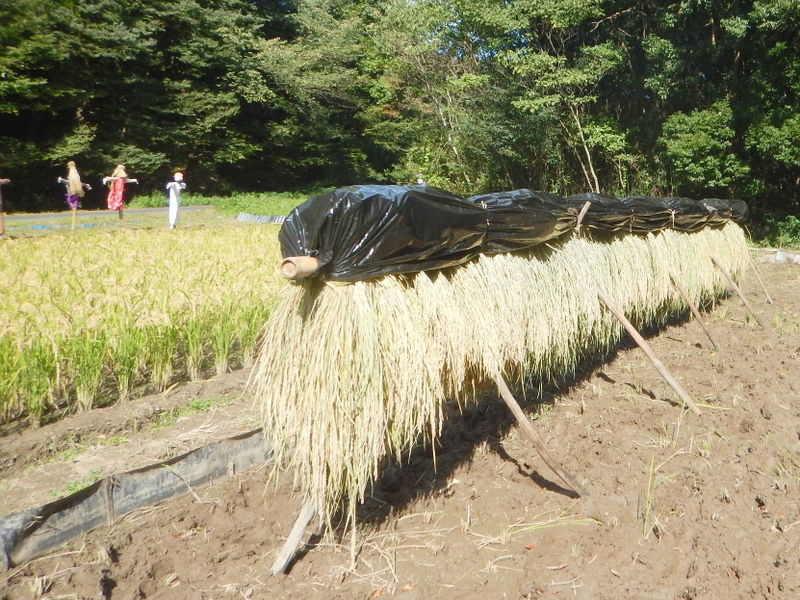 児沢の上の畑で収穫したゴマは束ね、児沢家の玄関の軒下で乾燥させています。週末に降雨の予報があるので、ブルーシートの上で束を逆さにして実をとりだしてみました。莢(さや)はじけて実が落ちているものもありましたが、逆さにしてはたいてもとりきれず、また干してあるものがあります。昨年に続いてお手伝いいただいた森さん、ありがとうございました。
