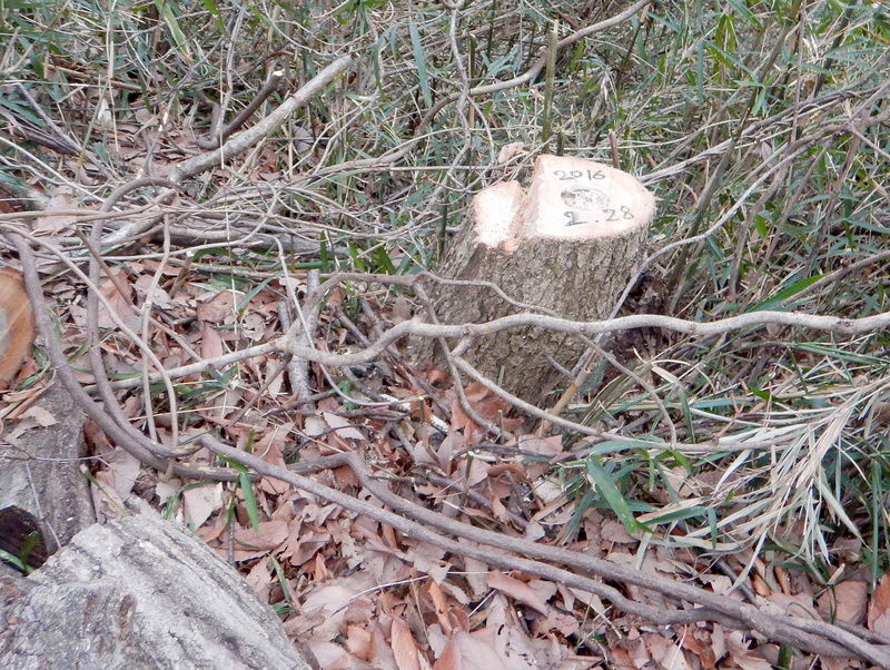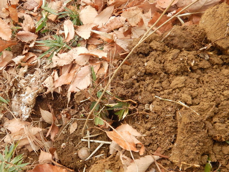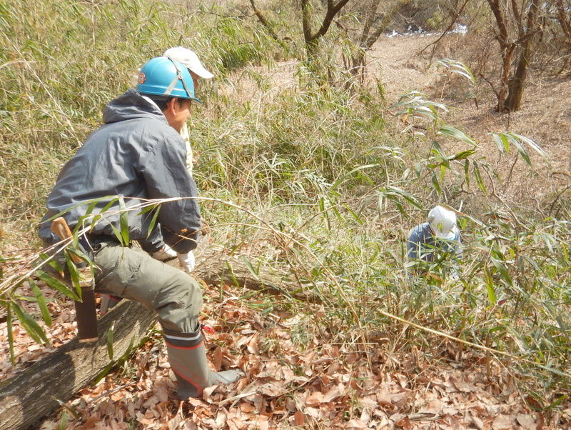 岩殿A地区に下りてくる坂道の下側にはサワラの木が1本生えています。道側は桑園、田んぼ側は田んぼがあったようです。私たちとは作業時間帶がずれているので、すれ違いになっていることが多いのですが、須田さんがかなりきれいにアズマネザサと潅木を刈払っています。ありがとうございます。