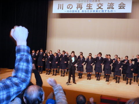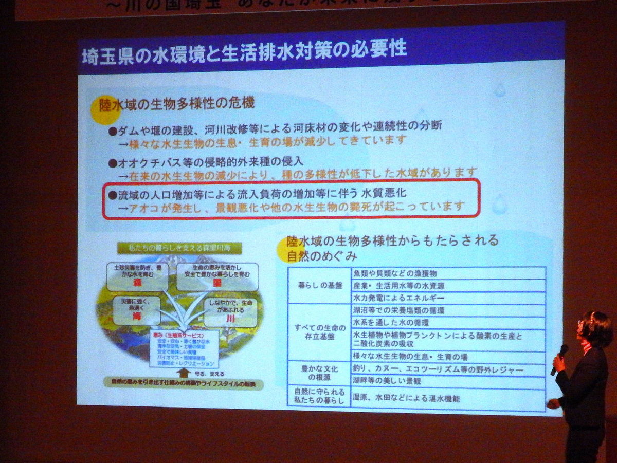 午前の部は司会は埼玉県立浦和第一女子高等学校アナウンス部、オープニングコーラスは伊奈町立小針中学校合唱部、講演は、環境省大臣官房廃棄物・リサイクル対策部廃棄物対策課浄化槽推進室浄化槽企画官吉川さんの「浄化槽と埼玉県の水環境」、つづいて川の再生活動の事例発表がありました(→比企の川づくり協議会HP)。