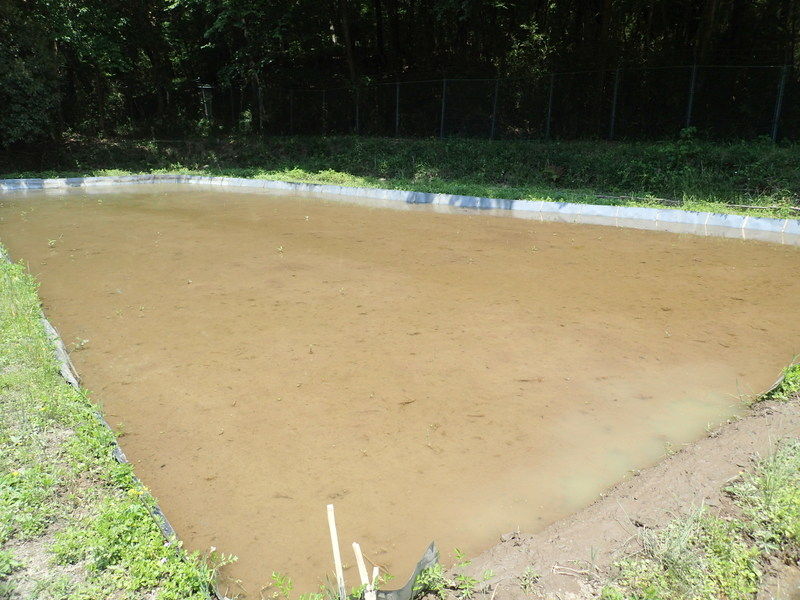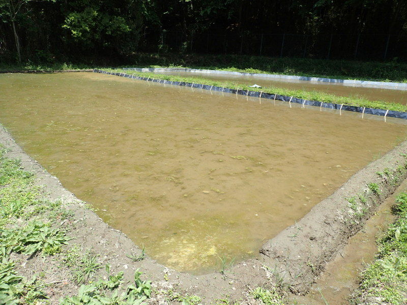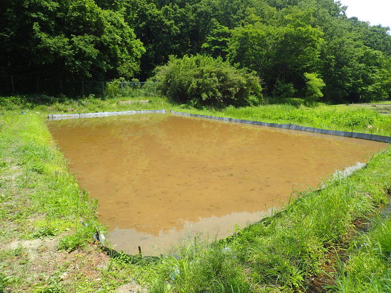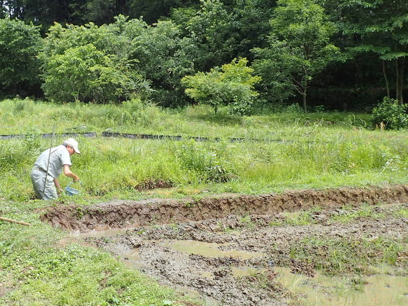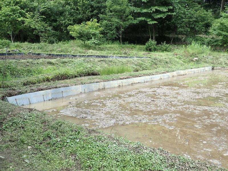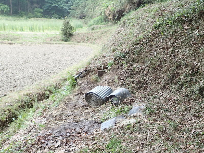 20日(金曜日)にボランティアの学生と植えた苗の水やりに、岩殿A地区の畑に来ていた須田さんにアライグマがワナにかかっているよと教えてもらいました。今日の日ざしと暑さのためか(?)すでに死んでいました。罠は20日にしかけたばかりです。
