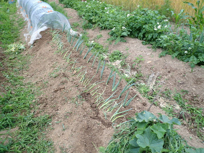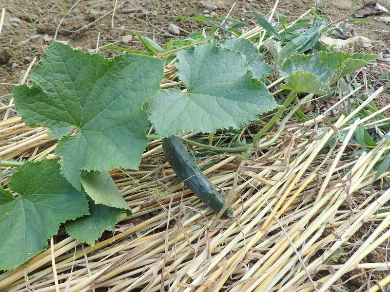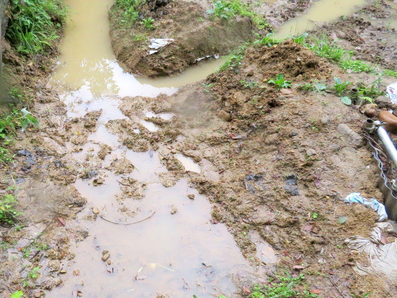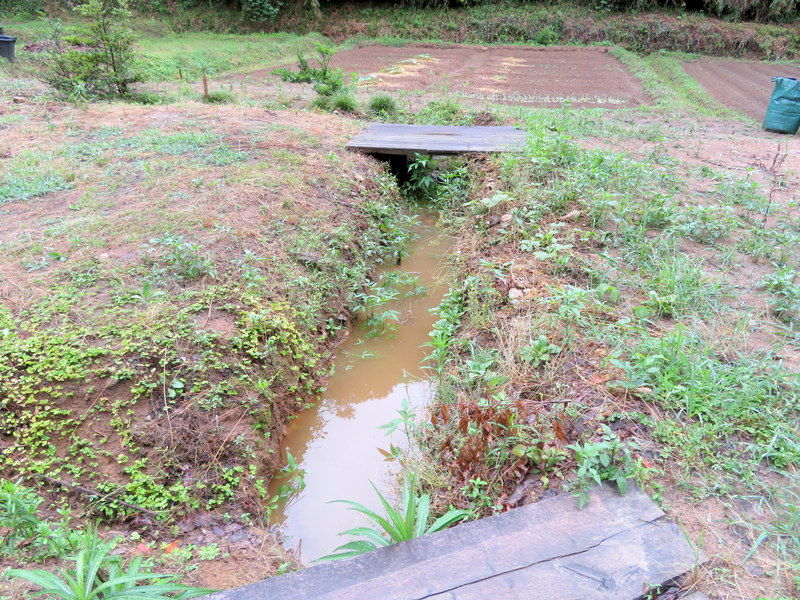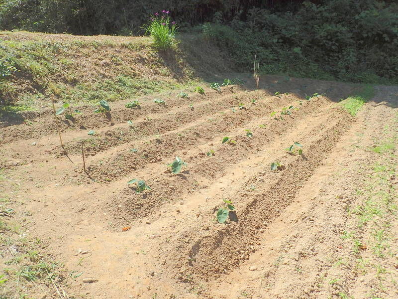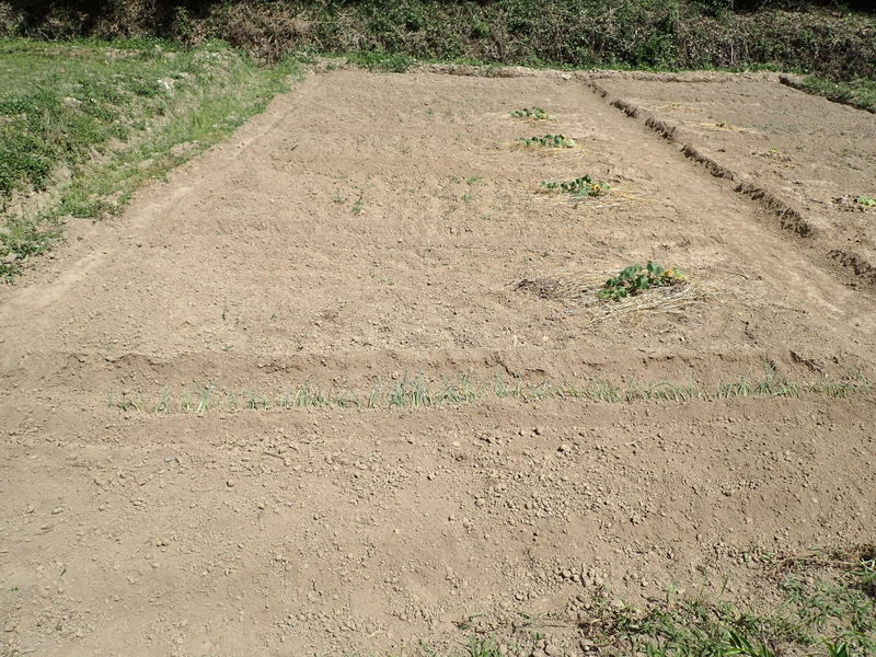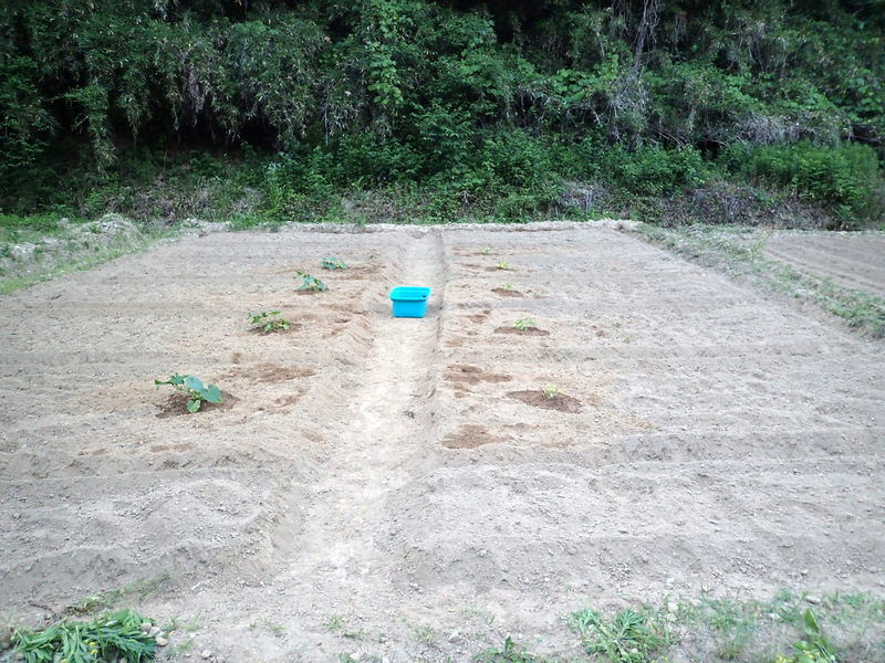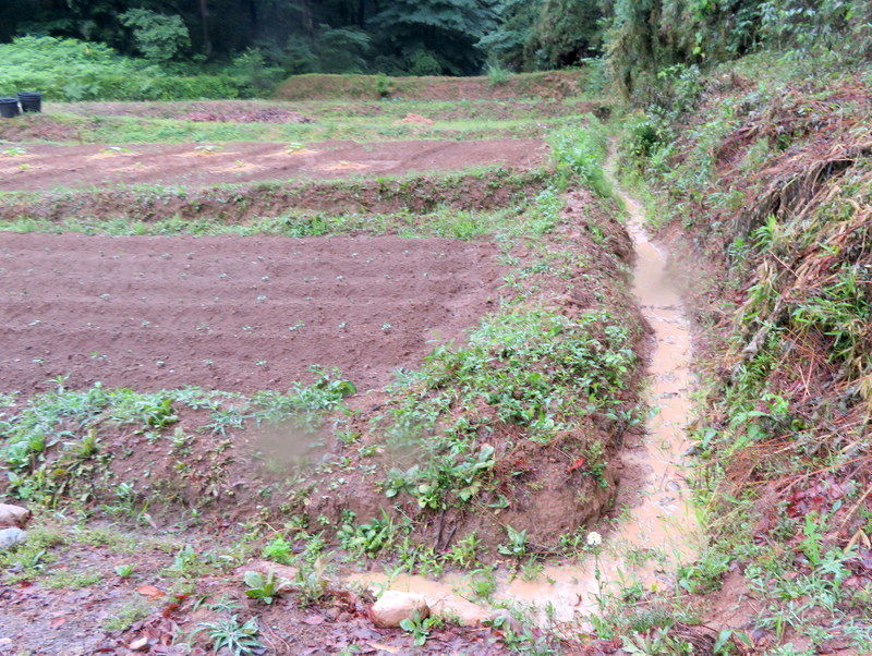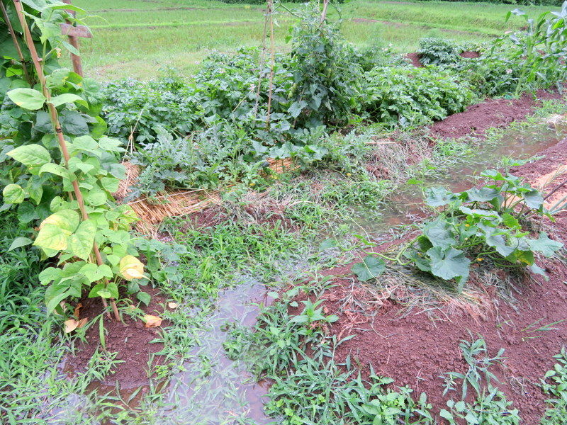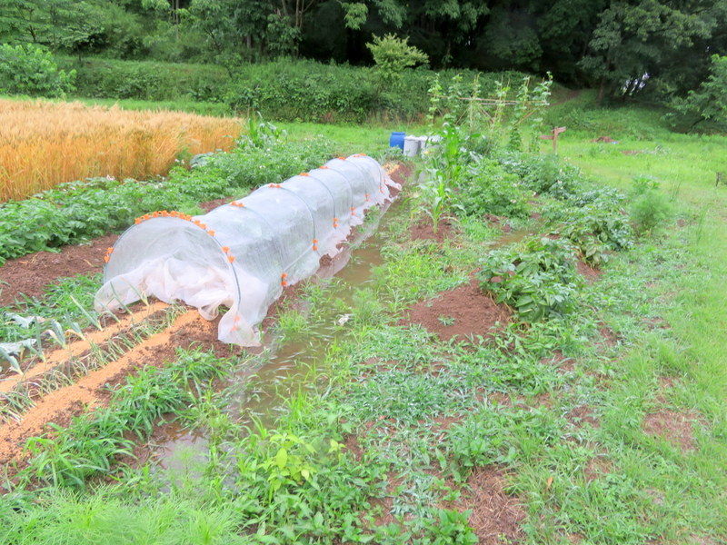 A地区の畑の畝間に水がたまっていました。高畝仕立てで、野菜が水没しないようにツルが伸びているところワラを敷いておいたのはよかったようです。