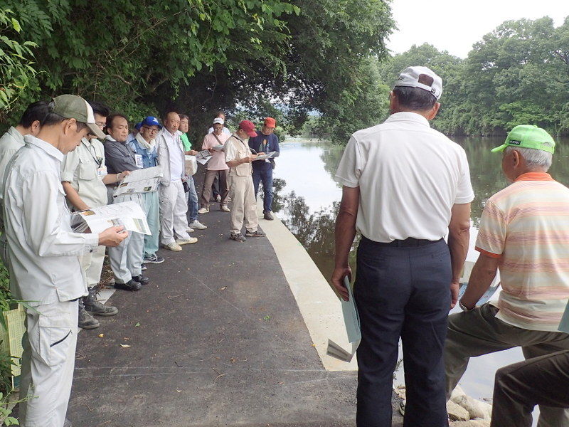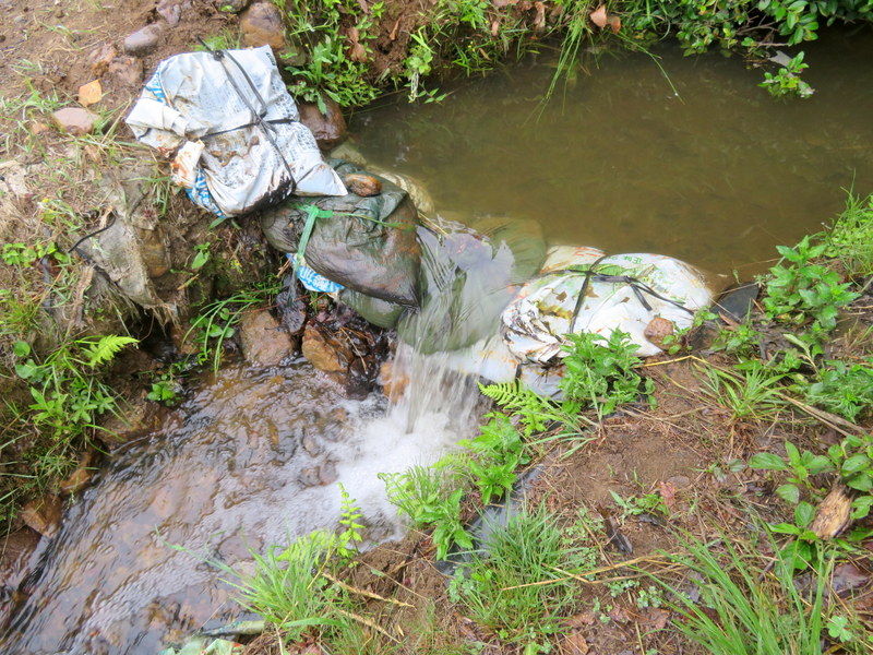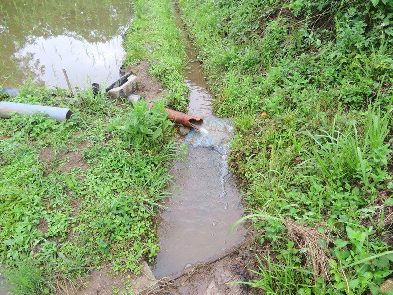 A地区の田んぼの水は、貯水池→上の田んぼ→下の田んぼ→排水路と流れます。池の水は必ず2枚の田んぼを通って排水される仕組みです。田んぼに充分に水がある時は水口を閉鎖し、貯水池から田んぼを通さずに下流に水が流せるように、田んぼの水口部分にあって堰の働きをしている土のう袋の高さを調節し、それが壊れないように補強しておく手直しが必要であることがわかりました。
