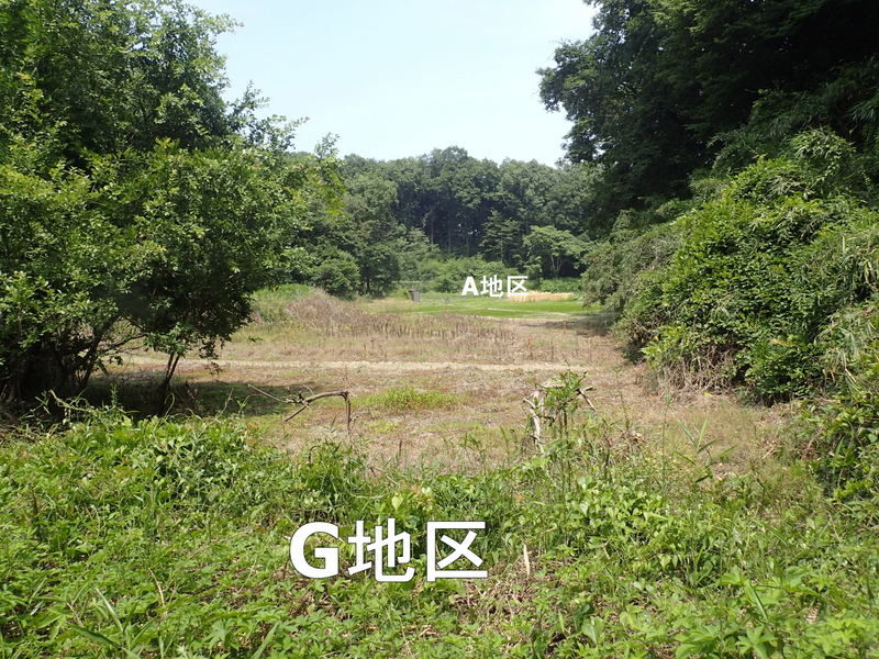 G地区の東側に枯れたセイタカアワダチソウ群落がある何枚かの耕作放棄された田んぼ、稲作をしている農家の田んぼ、岩殿A地区の畑と田んぼがあります。F地区とG地区の境界を刈れば、入山谷津のボッシュ林側は耕作放棄地を歩いて岩殿C地区まで縦断できるようになります。
