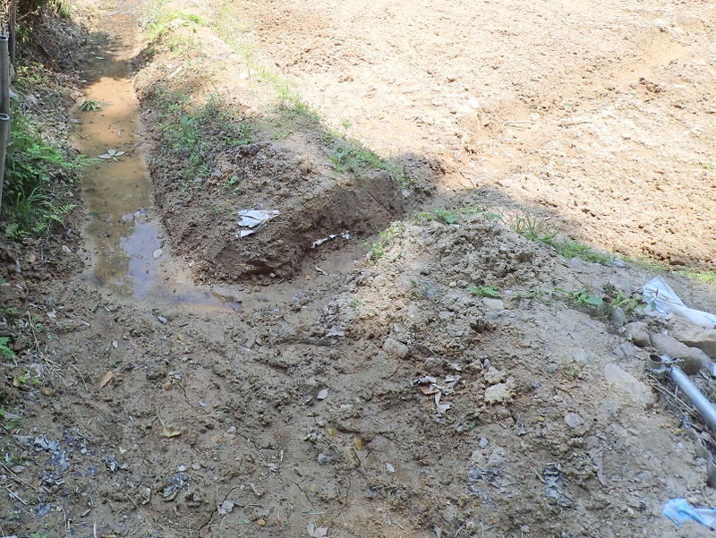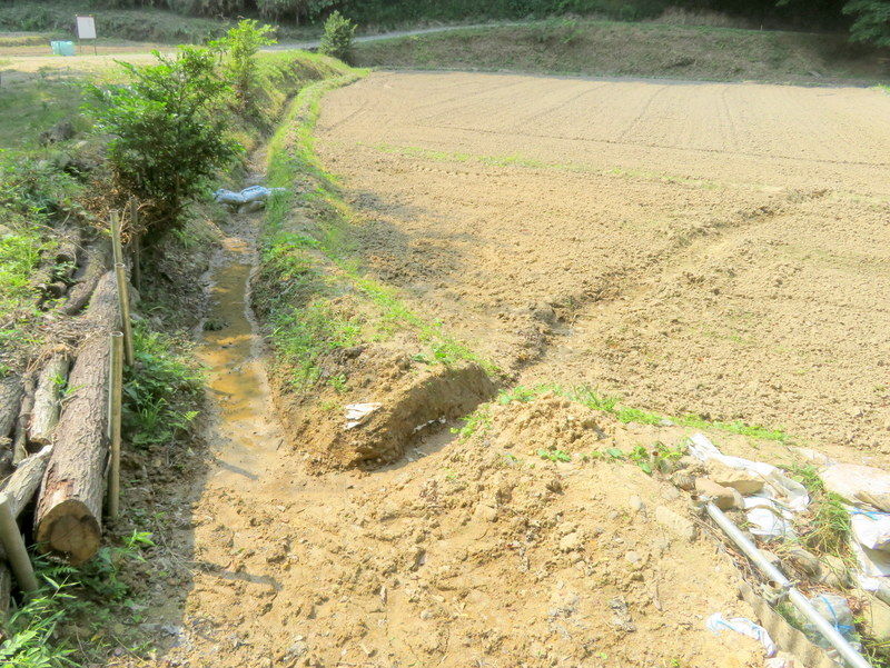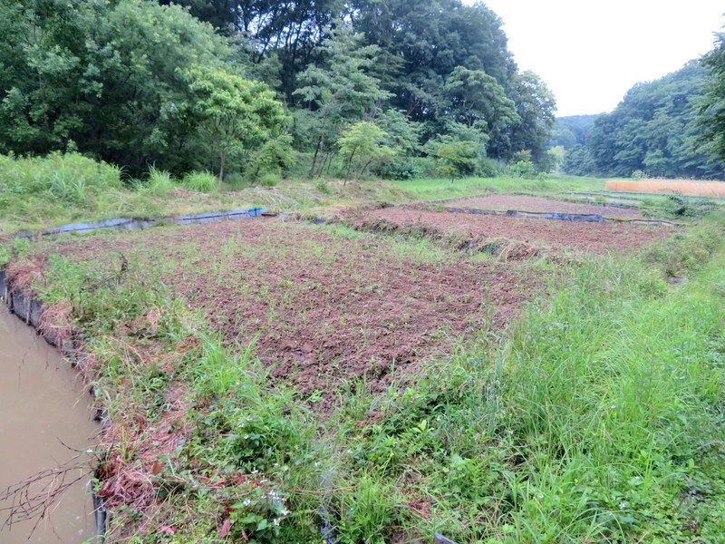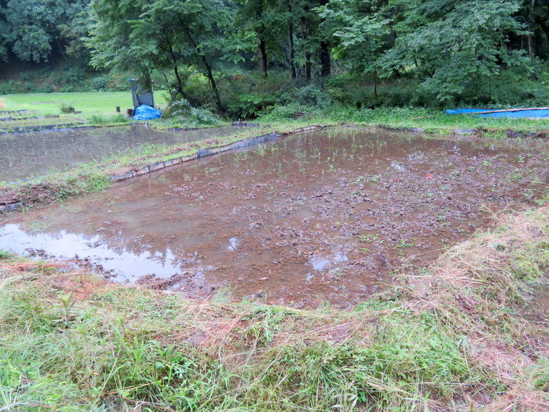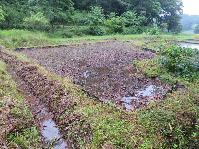 田んぼに入ってみると、長靴が沈む程度に水はたまっていました。ボッシュ林側の堰からと畑と市民の森の間の水路からの水が田んぼに入っていますが、どちらかというと市民の森側の絞り水が多いくらいです。畑への浸水防止に掘った排水用の溝を掘り直して水路に流しました。田んぼの表面の濁った水はそのせいです。