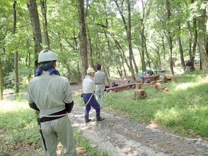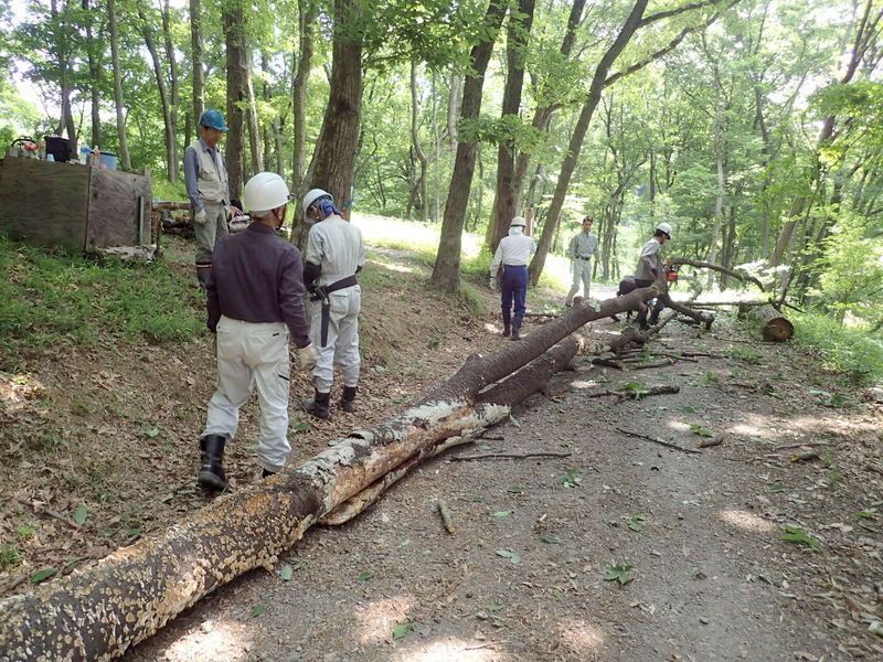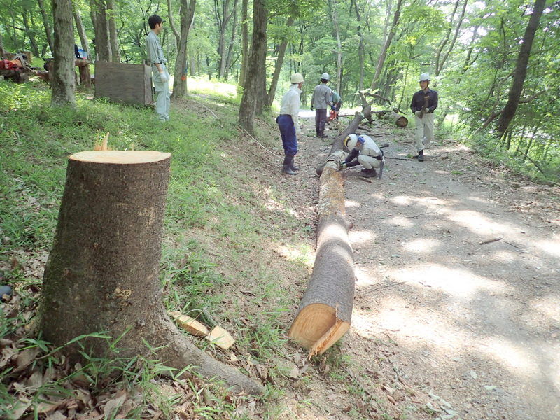 伐倒方向を作業道の上と決め、渡部さんがチェーンソー、全員でロープを引いてドンピシャリ、路上に倒しました。