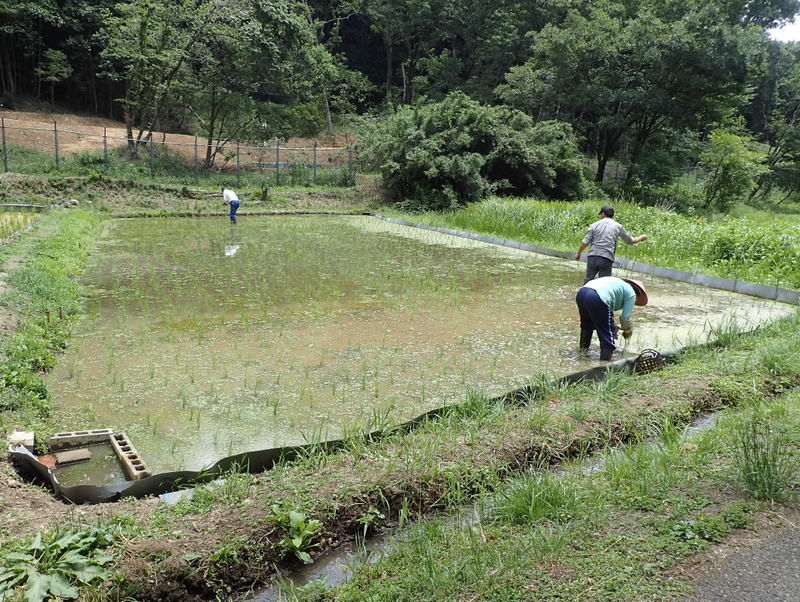 ECOM主催『比企ツーリズム』の「農的くらし入門コース」で、中澤健一さんの里山ぐるぐるスマイル農園の田植えに参加しました。今回は、ときがわ町日影の6畝の田んぼでコシヒカリを植えました。水を抜いた田んぼに筋つけの道具で線引きして30㎝のマス目を作り、交点に前進して植えていきます。