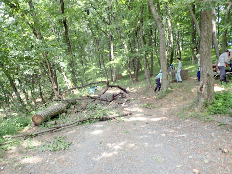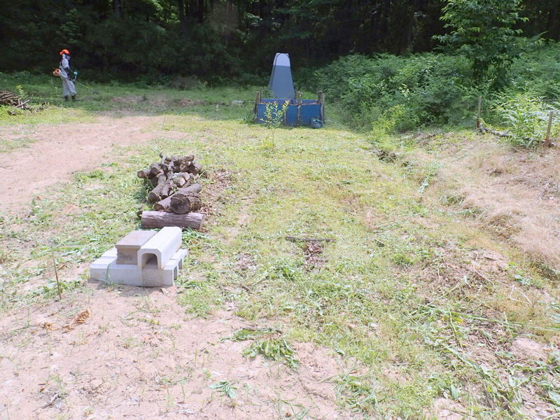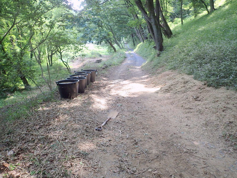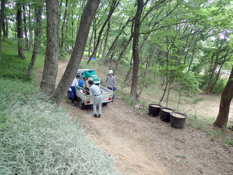 並行して、簡易トイレの片づけ、駒打ちしたシイタケのホダ木の本伏せ作業をすませました。