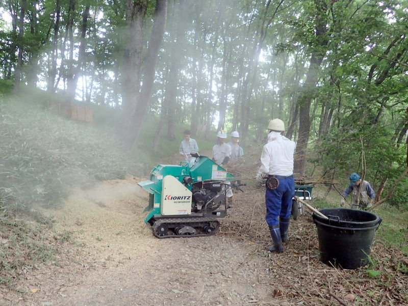 作業道下の斜面で伐採した3~4mの笹を、チッパーを使うことで効率良く片づけることができました。出来たチップはC地区に移動して野積みにし、発酵したものを堆肥として活用します。