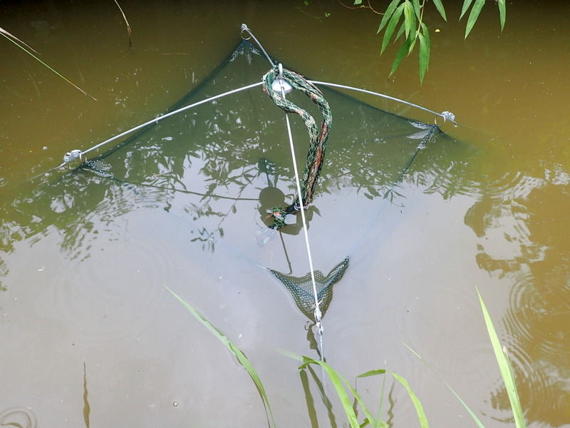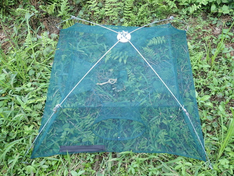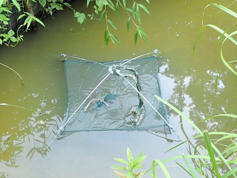 2) 小型定置網で稚ザリガニを抱えた雌を捕獲する