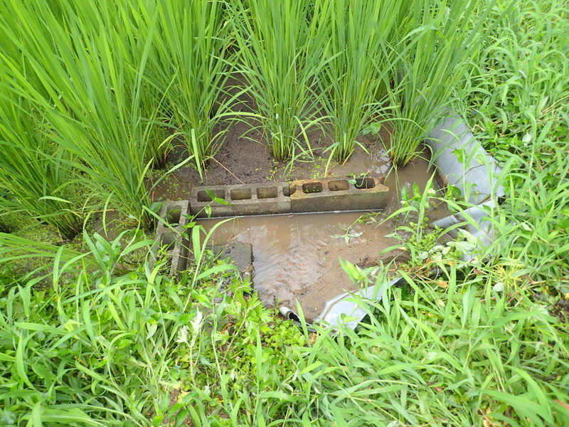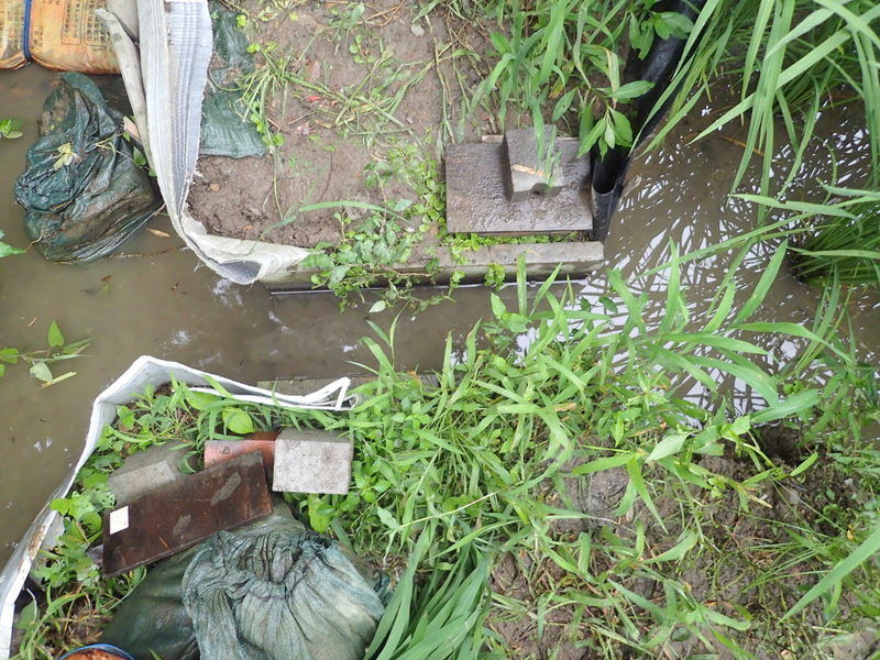 無名沼イ号の水は地中に埋めた塩ビ管を通って今年はカボチャを植えた「田んぼ」に引込まれていました。耕作放棄になる前の話です。田んぼを使わなくなってからは塩ビ管はフタがされて水が流れていませんでしたが、今日は水が音を立てて流れ出していました。フタにしていた土をつめた肥料袋が傷んで水口が開いたようです。畑に水がはいらないようにU字溝を臨時に置いて、しばらく様子を見ることにしました。ダイズ畑の上の溝を通って市民の森側の水路に落ち、下の田んぼに入っています。