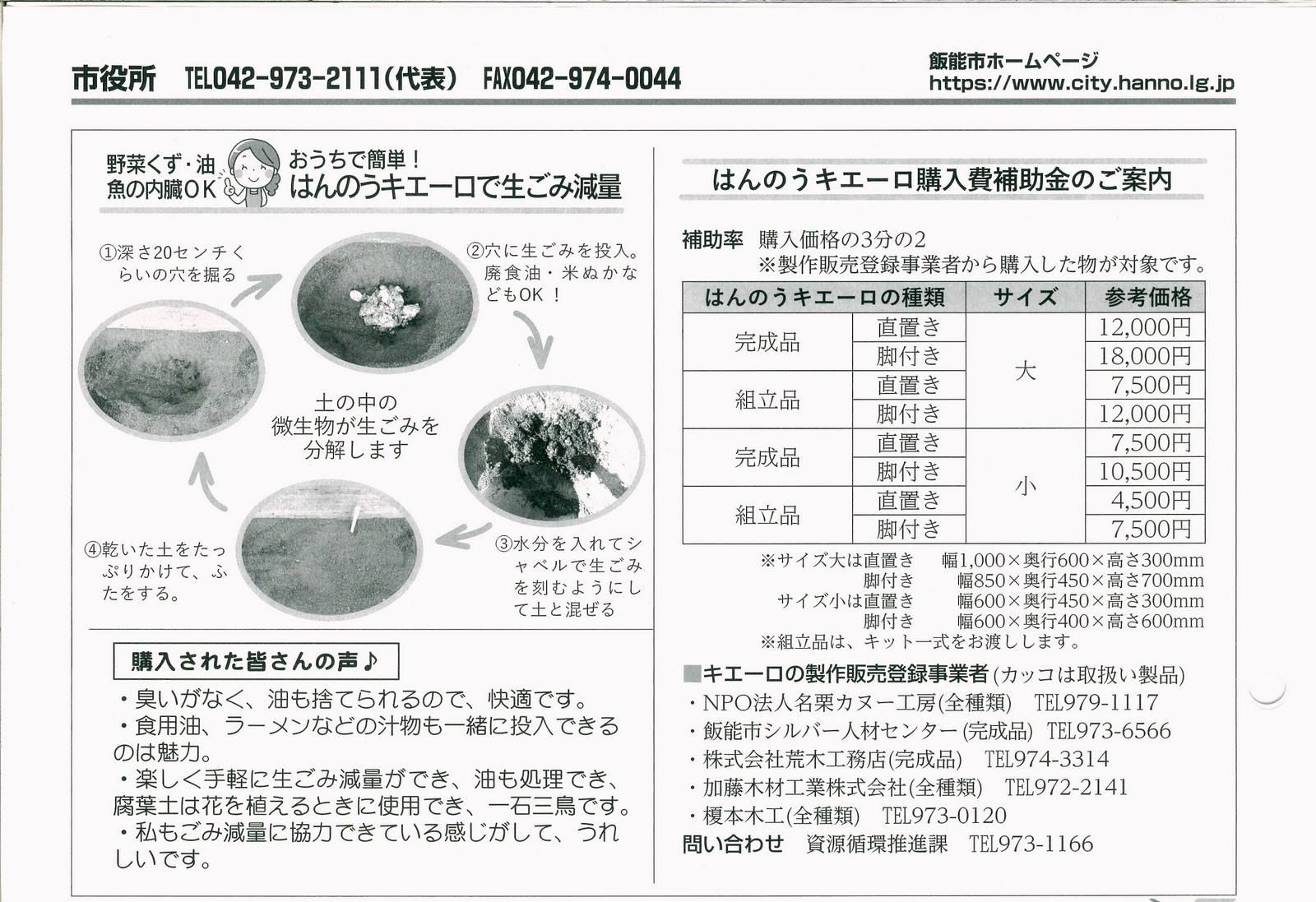 飯能市の広報(2017年8月号)に掲載されていた生ごみ処理容器キエーロの販売広告です。完成品・組立キット、直置き・脚付き、大・小サイズがあり、購入価格(18,000~4,500円)の3分の2が補助されるので6,000~1,500円で手に入ります。