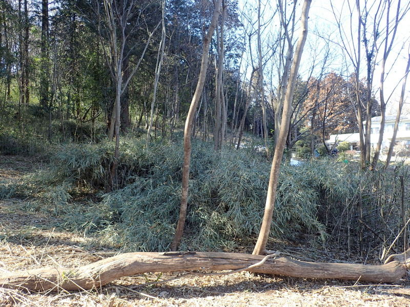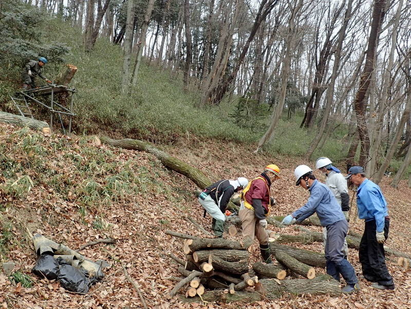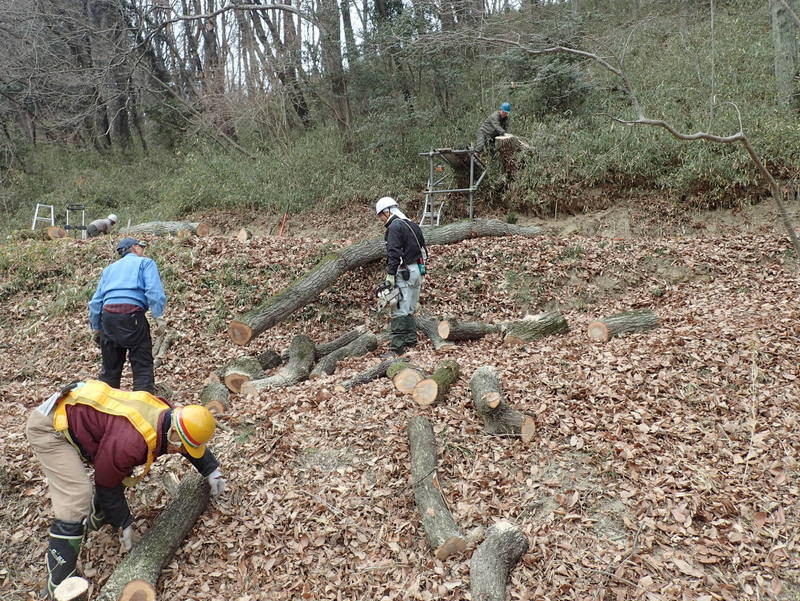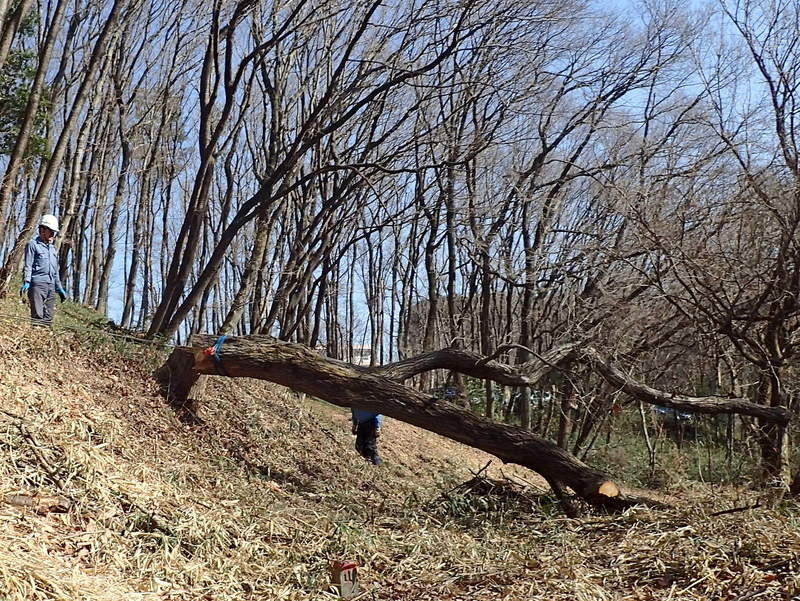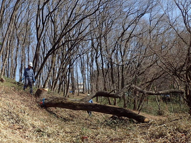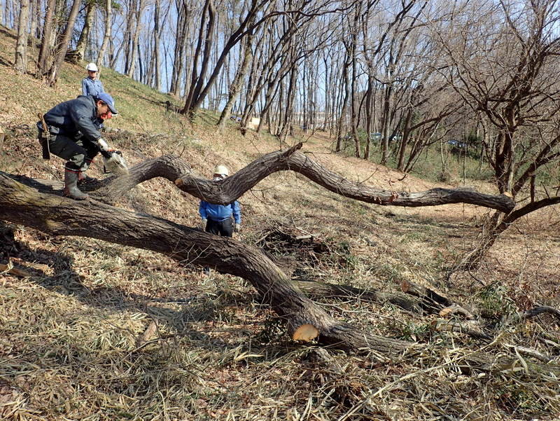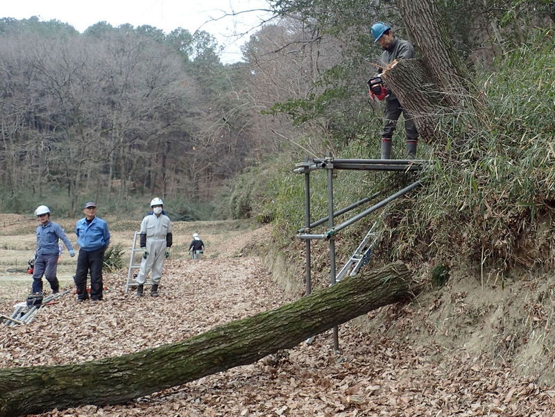 市民の森保全クラブ定例活動日です。参加者は芦田さん、片桐さん、金子さん、澤田さん、細川さん、鷲巣さん(正午頃から)、渡部さん、Hikizineの8人です。12月24日の作業の続きをして、作業道下に倒したコナラを整理しました。