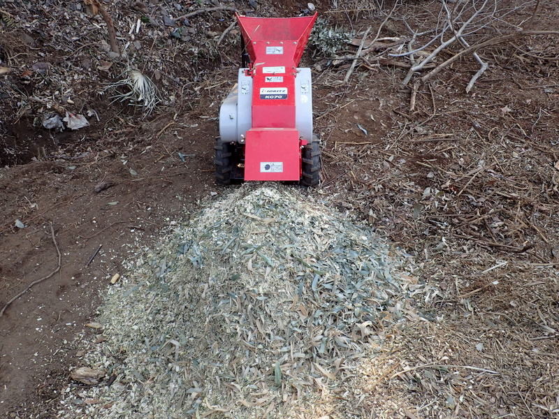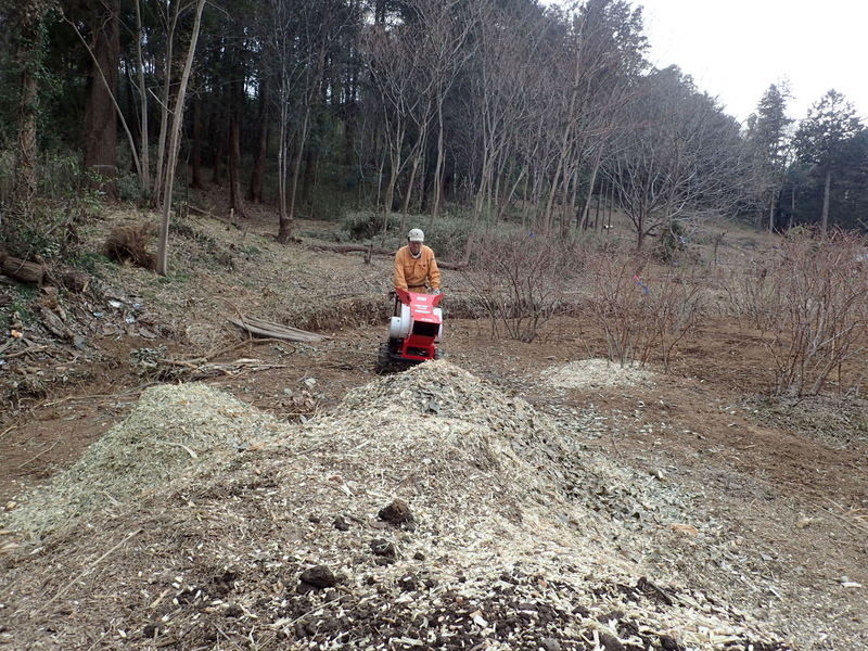 細い枝は岩殿F地区、玉切りしたものはC地区に積み、幹の太い部分は作業道沿いに並べました