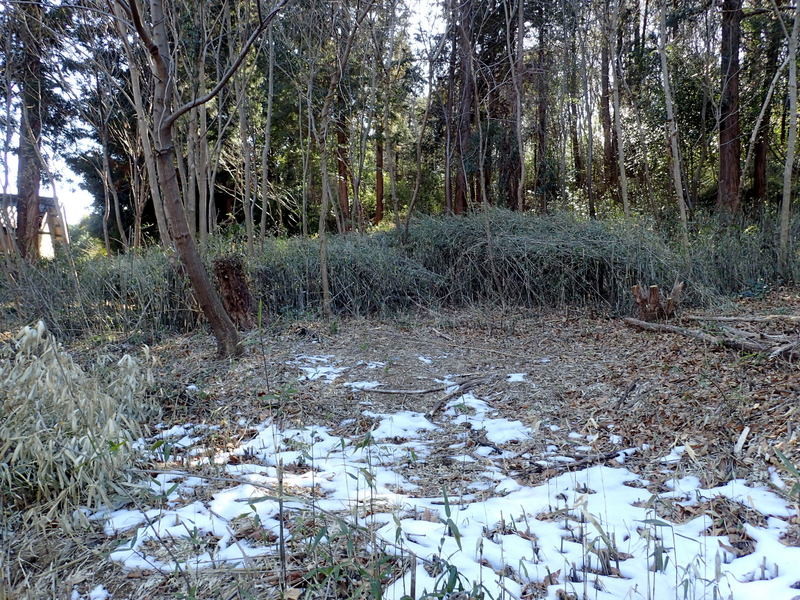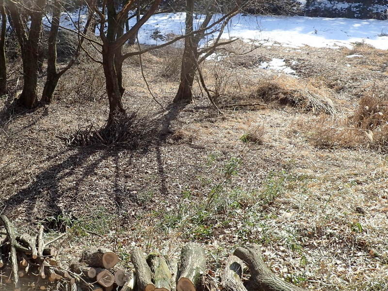 入山沼下の耕作放棄地、岩殿1397とその下で一段低い岩殿1372の境界にはアズマネザサの藪があります。境界の畦周辺の笹を刈ってみました。まだ半分位刈り残しています。