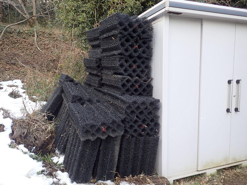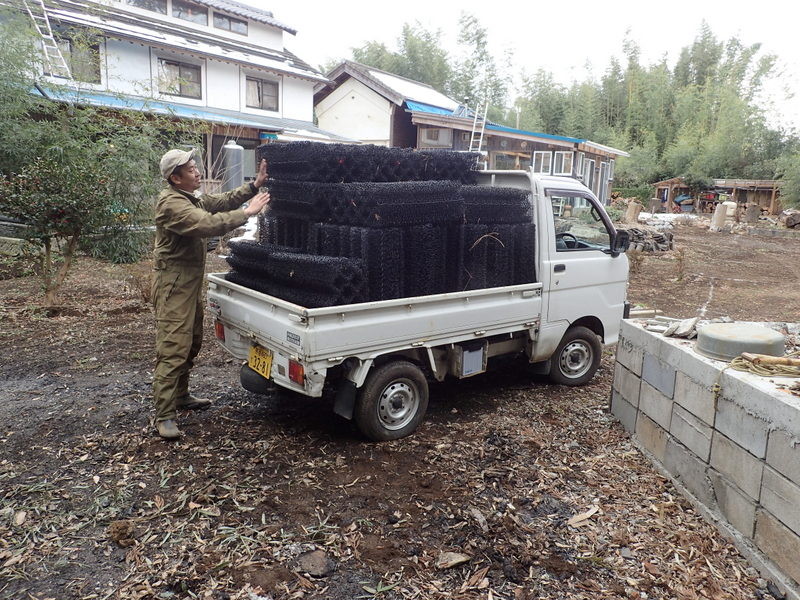 午後から、渡辺さんの仲介で、東松山市古凍のカフェ百水・エコヴィレッジ東松山さんに保管されていたヘチマロン(ポリプロピレンを植物のヘチマの乾燥繊維状の立体網目形状に成型した土木用材)を頂戴しました。ありがとうございます。