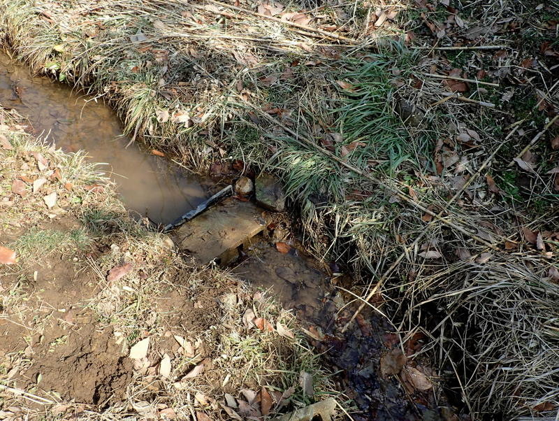 丘陵地でも「谷戸」の場合、保全の最重点は湧水の維持です。池の沢の場合奥の湿地だけでも湧水のわき出し口が10箇所あります(赤丸印)。赤矢印の左側見えない所に3箇所あります。わき出し口は、いずれも丘陵地と湿地の境目です。