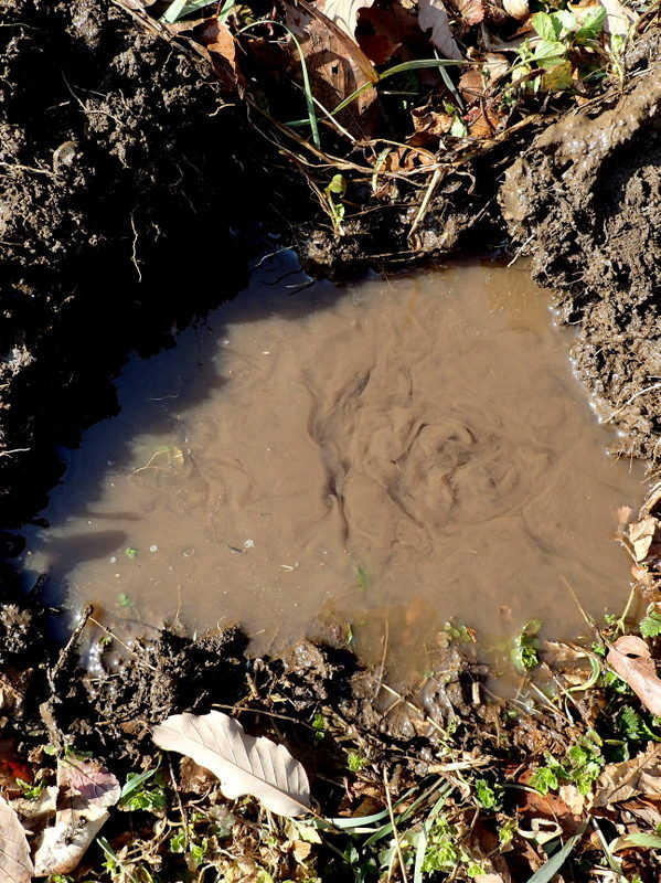 ところが、現在は長い年月がたち、池に大量の堆積物が貯まりカサスゲの群落を中心とする多様な植物の茂る湿地となっています。湿地の水面は点線のところです。湧水のわき出し口は、堆積物の貯まった水面の位置よりも低いところに埋没しています。堆積物の内容は、土砂を含むものの大部分は周辺の落葉広葉樹林からの落ち葉です。深さは2mくらいあり、下部は炭化し始めています。江戸時代に「底なし沼」といわれた時代には、池の周囲は草地かあるいは針葉樹林だったのかも知れません。現在気になるのは、湿地の水面が堆積物の為に年々上がり、わき出し口が埋もれて塞がり、湧水が別のところに逃げていってしまう事です。これを防ぐのには湿地の下流の方から堆積物を取り除く事ですが、これは人力だけでは無理ですし、また、取り除いた大量の旧堆積物をどう処理するのかも問題です。湿地の中にはゲンジボタル・ヘイケボタル・スジグロボタルが棲息していますし6種類の貴重な植物もありこれらは、発芽しないまま長期にわたり堆積した地中に残っている種子もあります。浚渫作業をする場合にこれらの保全をどうするのか・・・、見通しが立ちません。