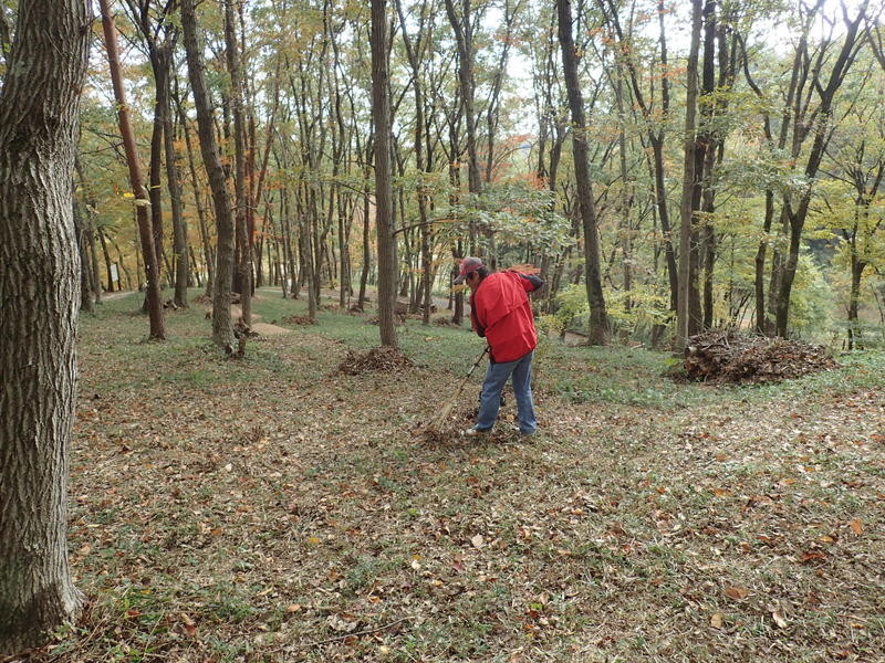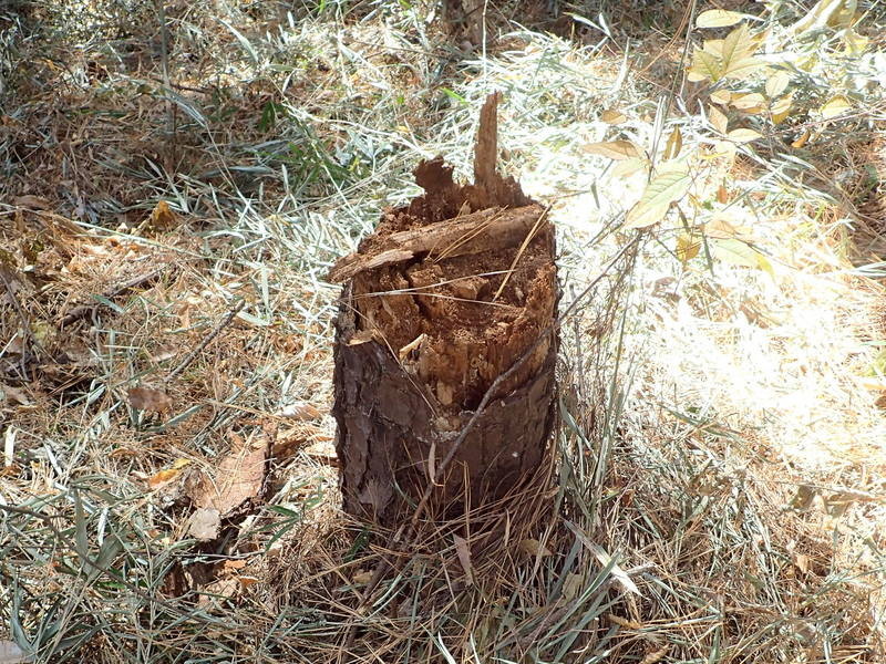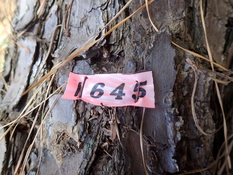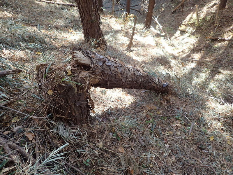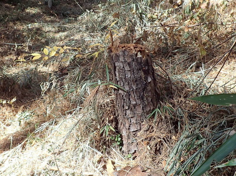 市民の森のマツ(アカマツ)には1本ごとに番号をふったシールが貼られています。2016年1月のシールが最近のもので、松枯れ防止のために樹幹注入剤を使用した時に作業用につけたものです。尾根の園路沿いの高木が園路をふさいで倒れたり、掛かり木になると、委託業者が速やかに片づけていますが、斜面のものは放置され、時が経つと写真のような姿になっていきます。
