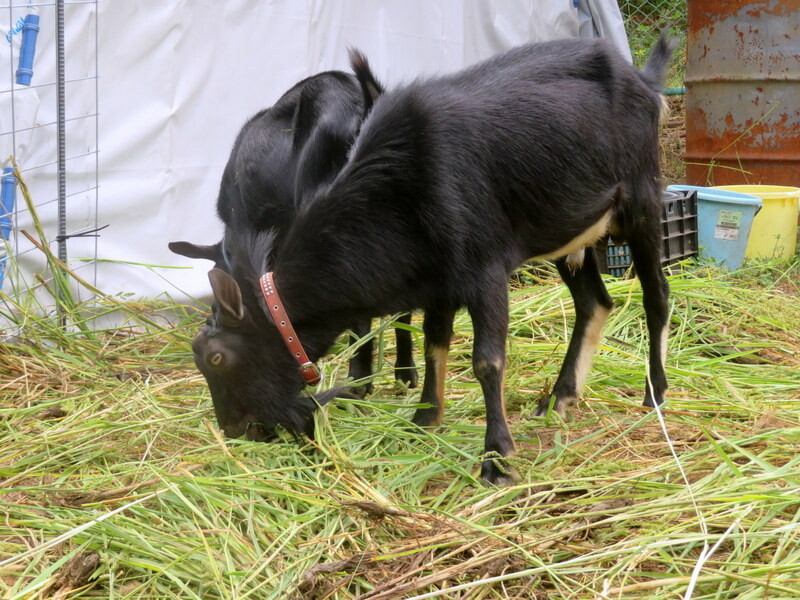 「ここ (学内の傾斜地) は笹も多いんですが、ヤギだとこういう固い草も好んで食べてくれます。牛だとこうはいきません。雑草を食べさせようと思って放しても、やせ細って弱るまであまり喜んで食べません。人間の方が根負けしてエサをくれるのを知っているのかも」