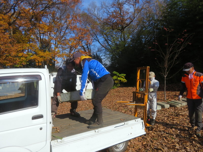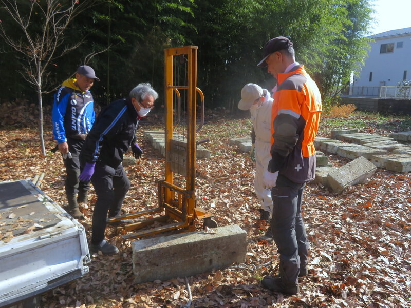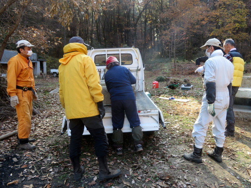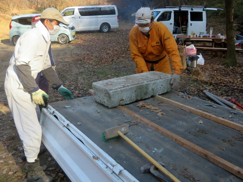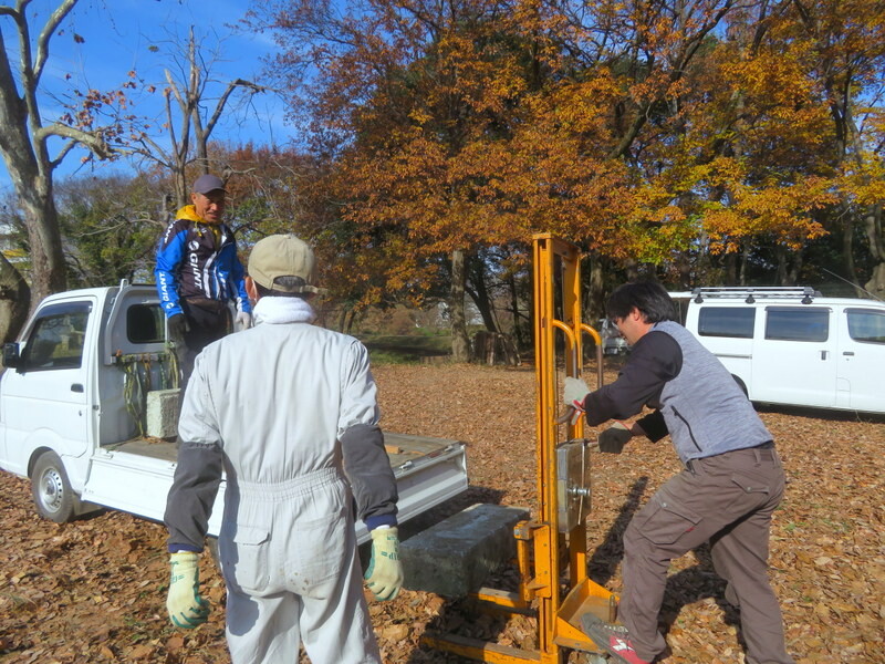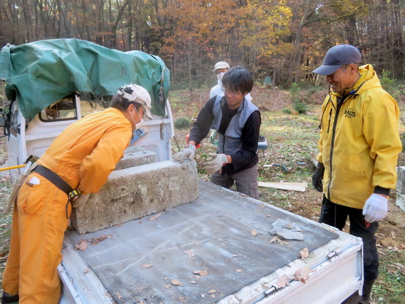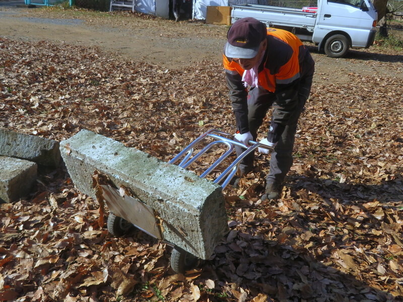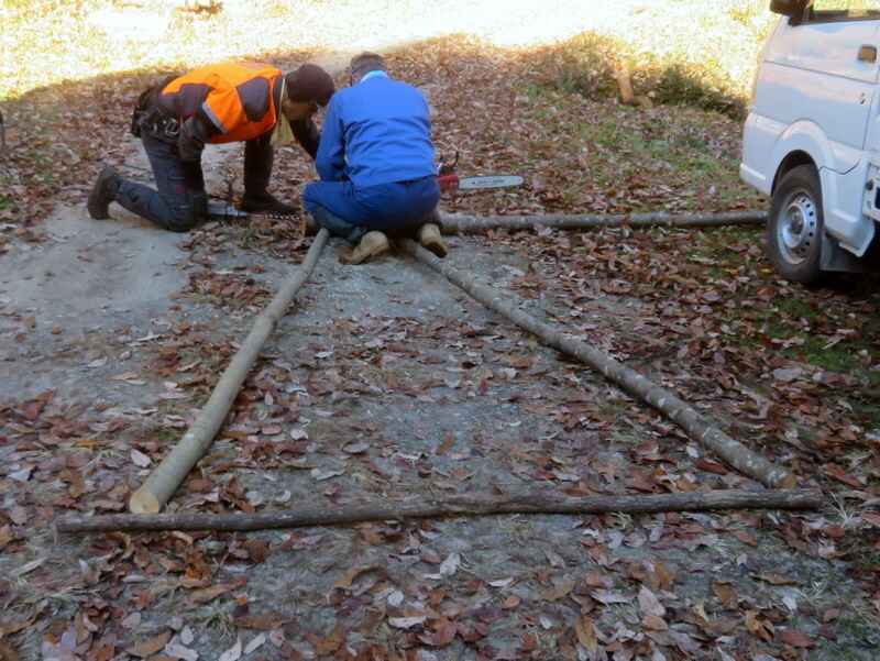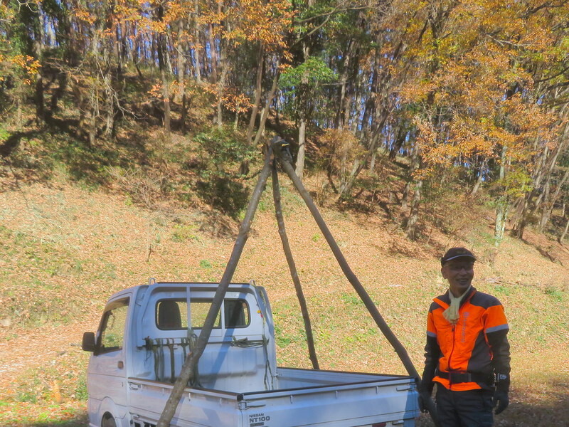 前記事の続きです。12月11日にピザ釜に使う大谷石を岩殿C地区に運んくる予定です。1個70㎏もあるのでチェーンブロックで吊り上げて軽トラに載せます。鳥取さんが岩殿I地区の雑木を伐って三叉[さんさ]を試作しました。