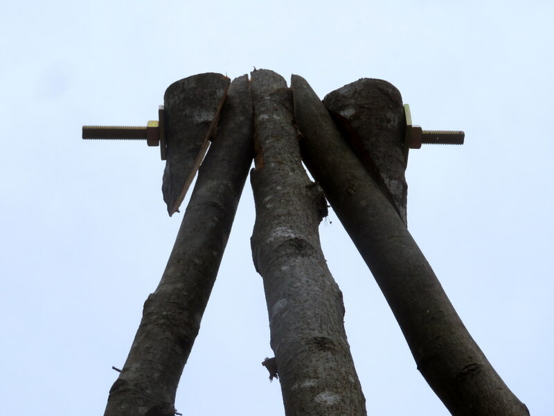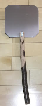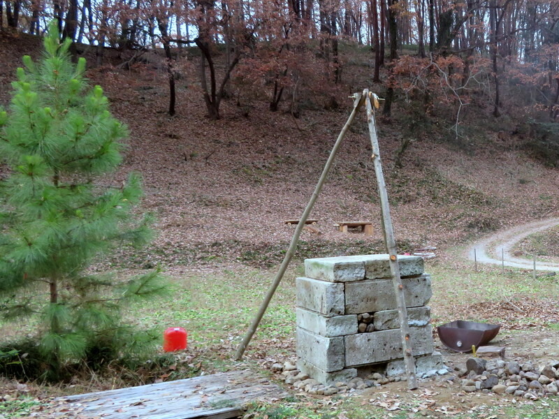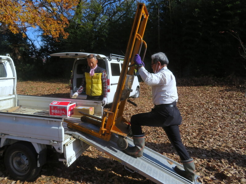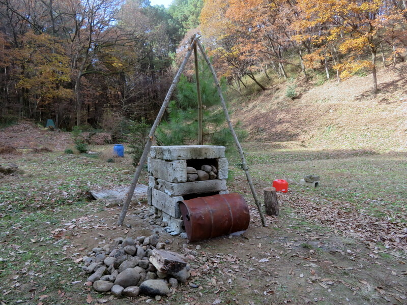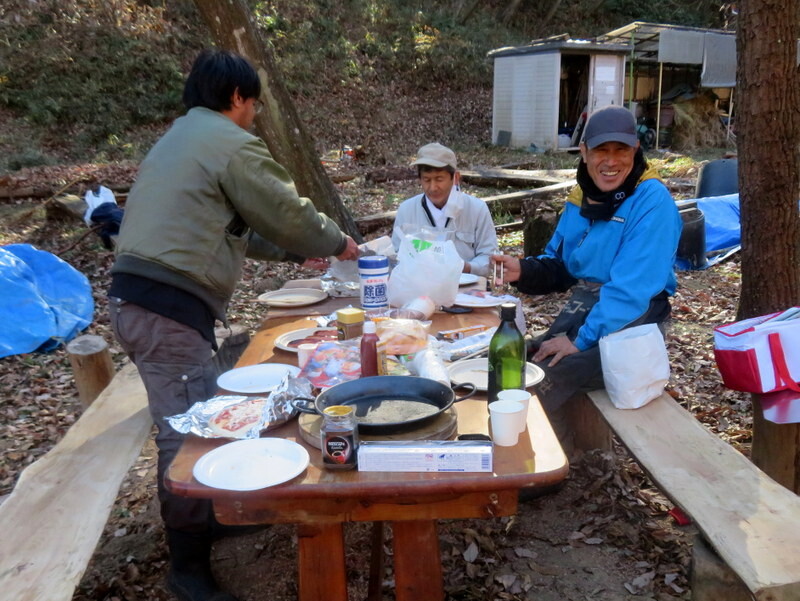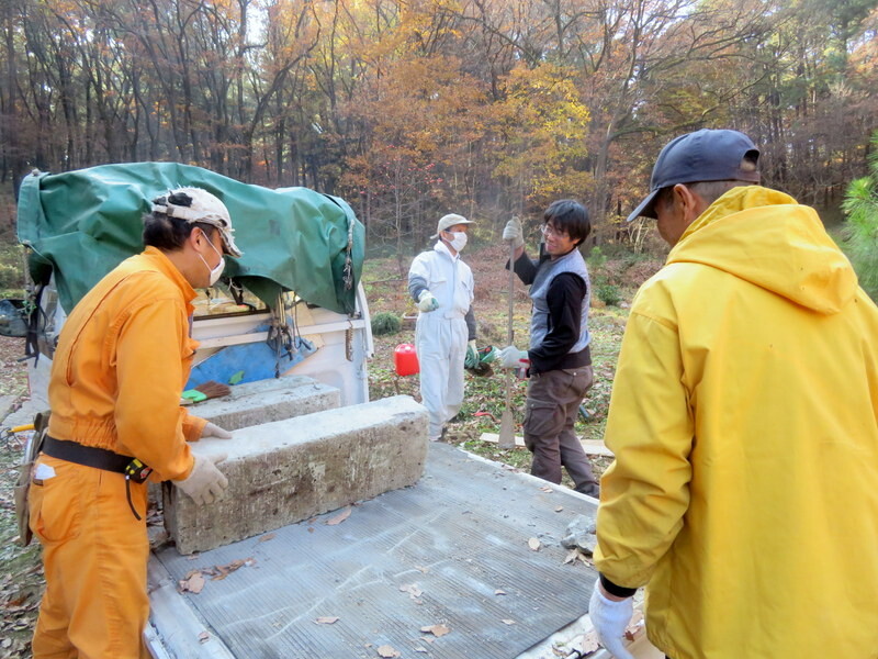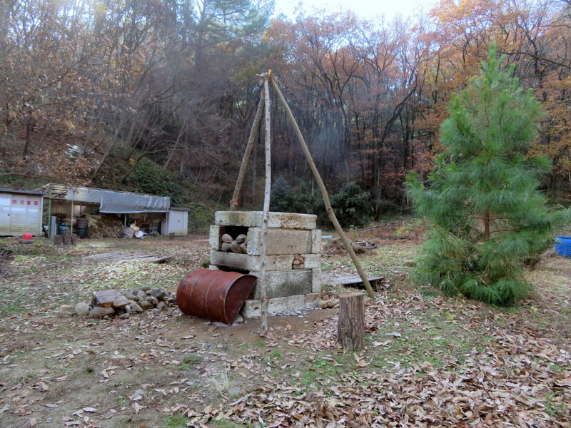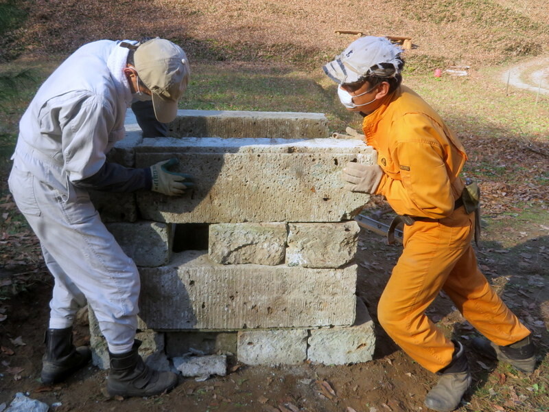前記事の続きです。12月11日にピザ釜に使う大谷石を岩殿C地区に運んくる予定です。1個70㎏もあるのでチェーンブロックで吊り上げて軽トラに載せます。鳥取さんが岩殿I地区の雑木を伐って三叉[さんさ]を試作しました。