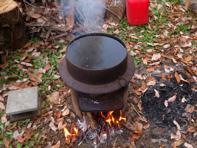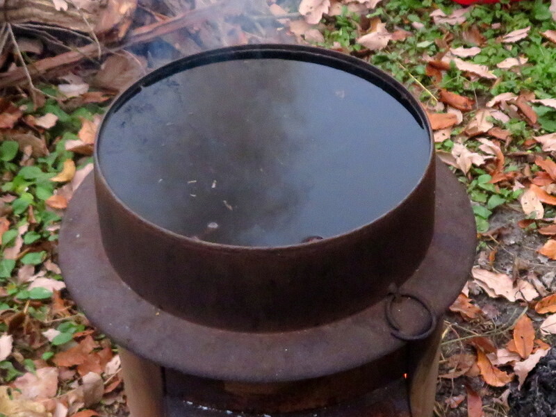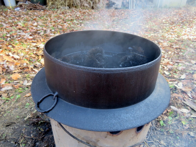 クリのイガ、葉っぱ、樹皮なを煮立てて鉄瓶の錆[さび]取りに挑戦の記事(日常生活日記『なかだのほど暮らし』)を見て、赤さびの出た鉄釜に児沢家と岩殿H地区で拾ったクリのイガを入れて煮てみました。タンニンで釜の内側が茶色から黒くなっているはずです。
