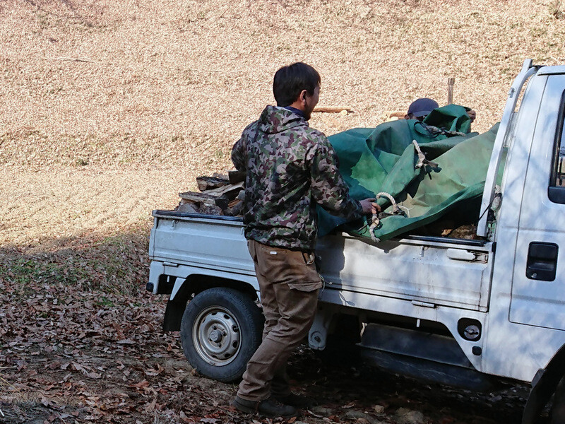 新井さんが田島さんと軽トラで薪の端材を届けてくれました。ありがとうございます。