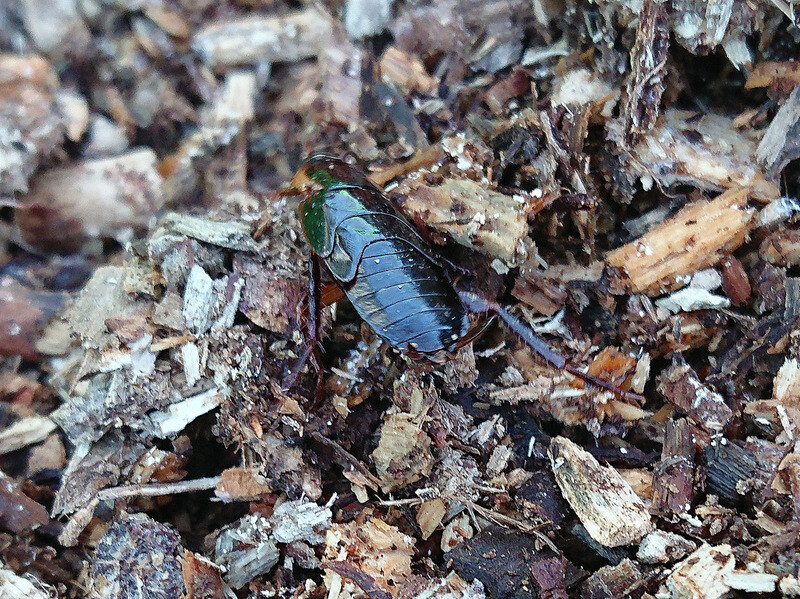 落葉堆肥箱にいれたチップの中にゴキブリ?がいました。屋外、森林のゴキブリは落ち葉や枯れ枝などを分解する重要な役割を持っています。