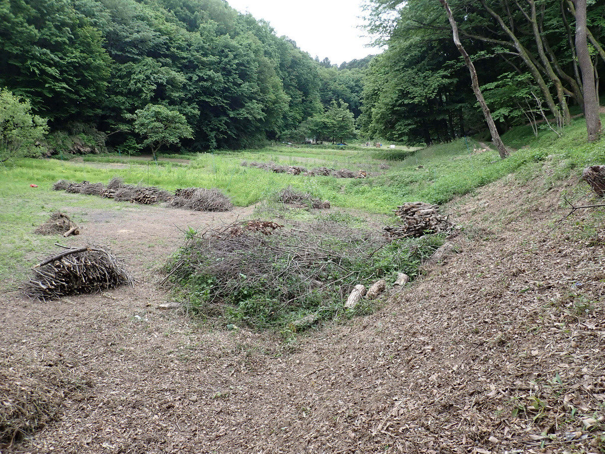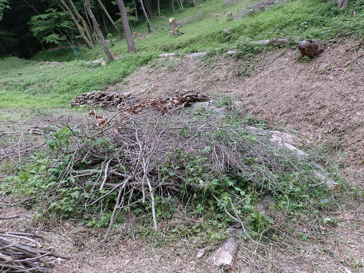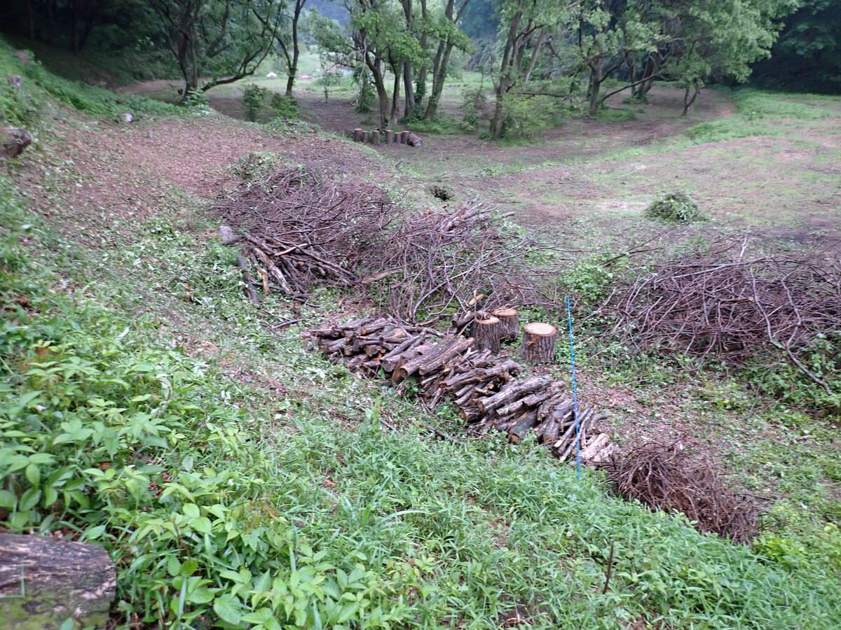 F地区植物調査枠西側に整理して積んでいる残材はボッシュ林側に運んで沢沿いに並べ、水路保全に使用してみます。