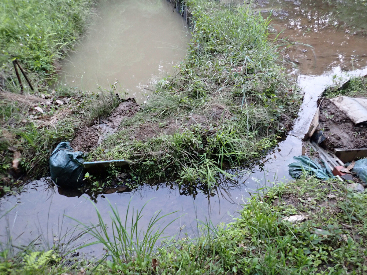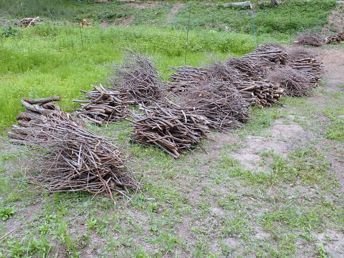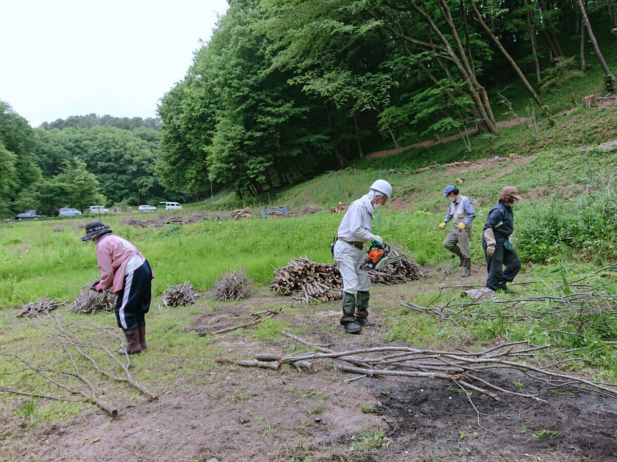 F地区植物調査枠西側に整理して積んでいる残材はボッシュ林側に運んで沢沿いに並べ、水路保全に使用してみます。