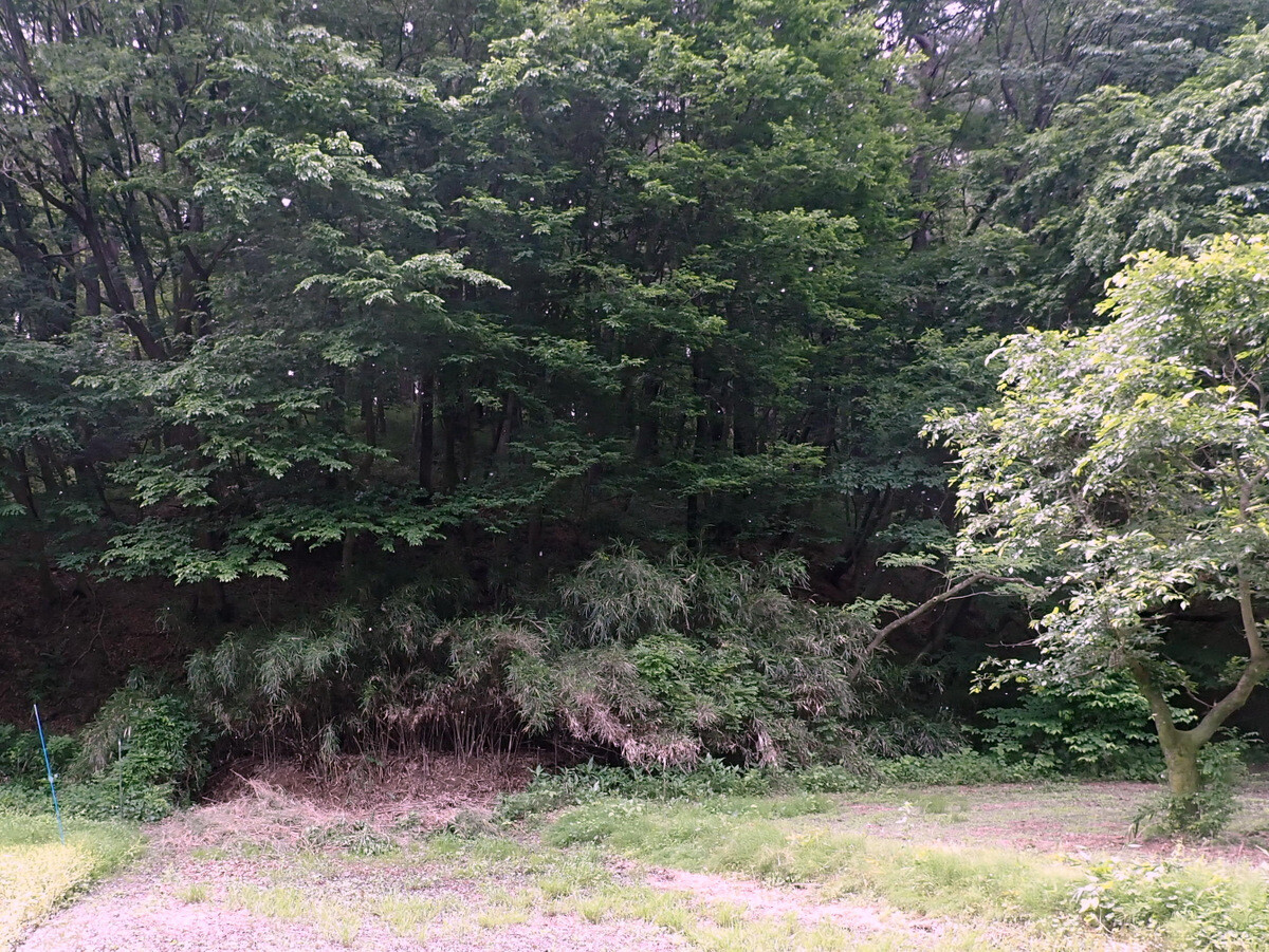 坂を下りたところにコナラの実生稚樹があって、半分ほど刈ってしまってから気づいて、保護のための目印に竹で囲っておきました。