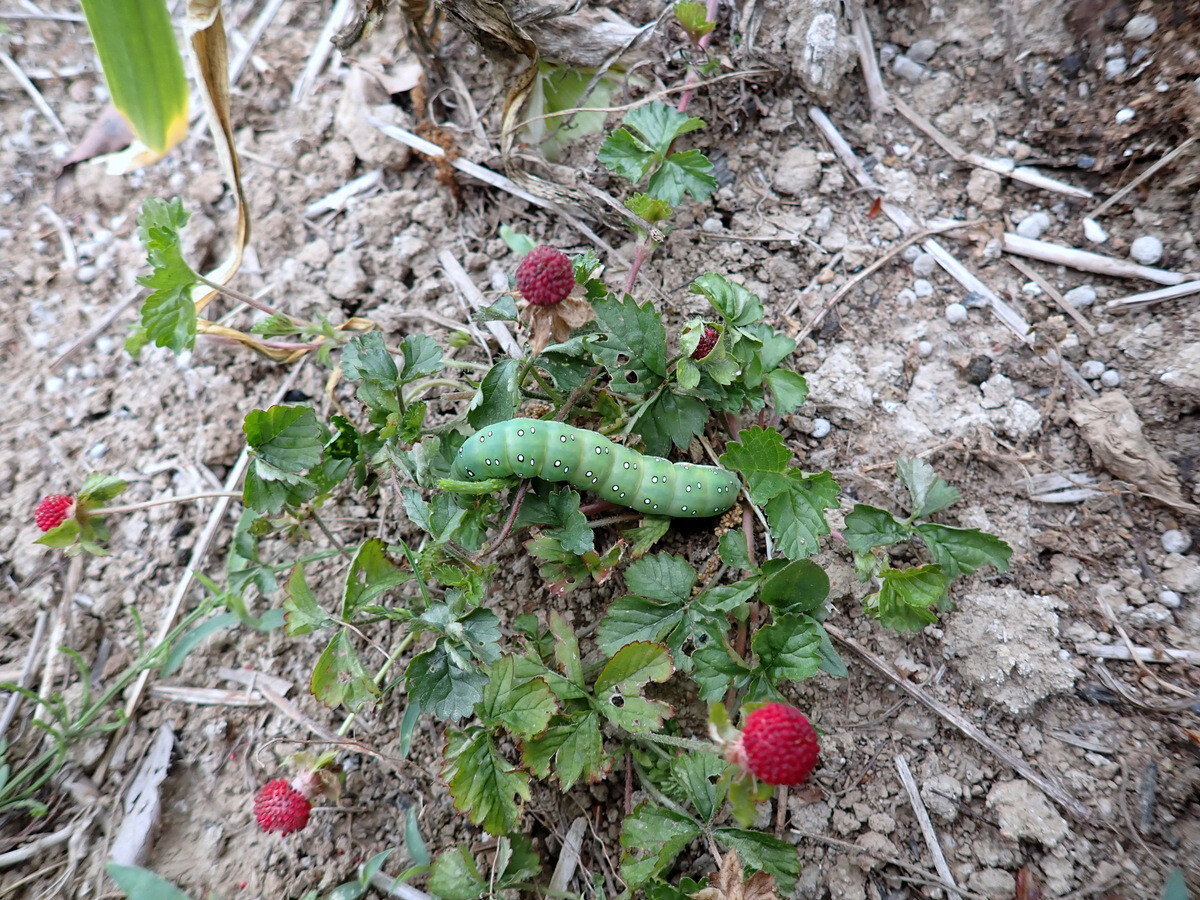 ※畑にいたアヤモクメキリガ(ヤガ科)の幼虫。広食性でいろいろな野菜の苗にもついています。