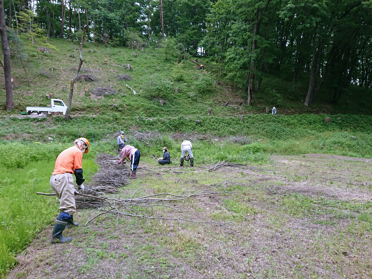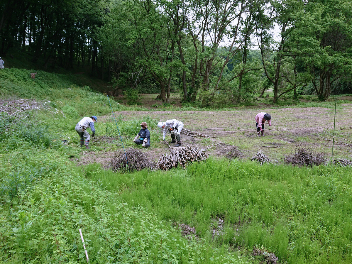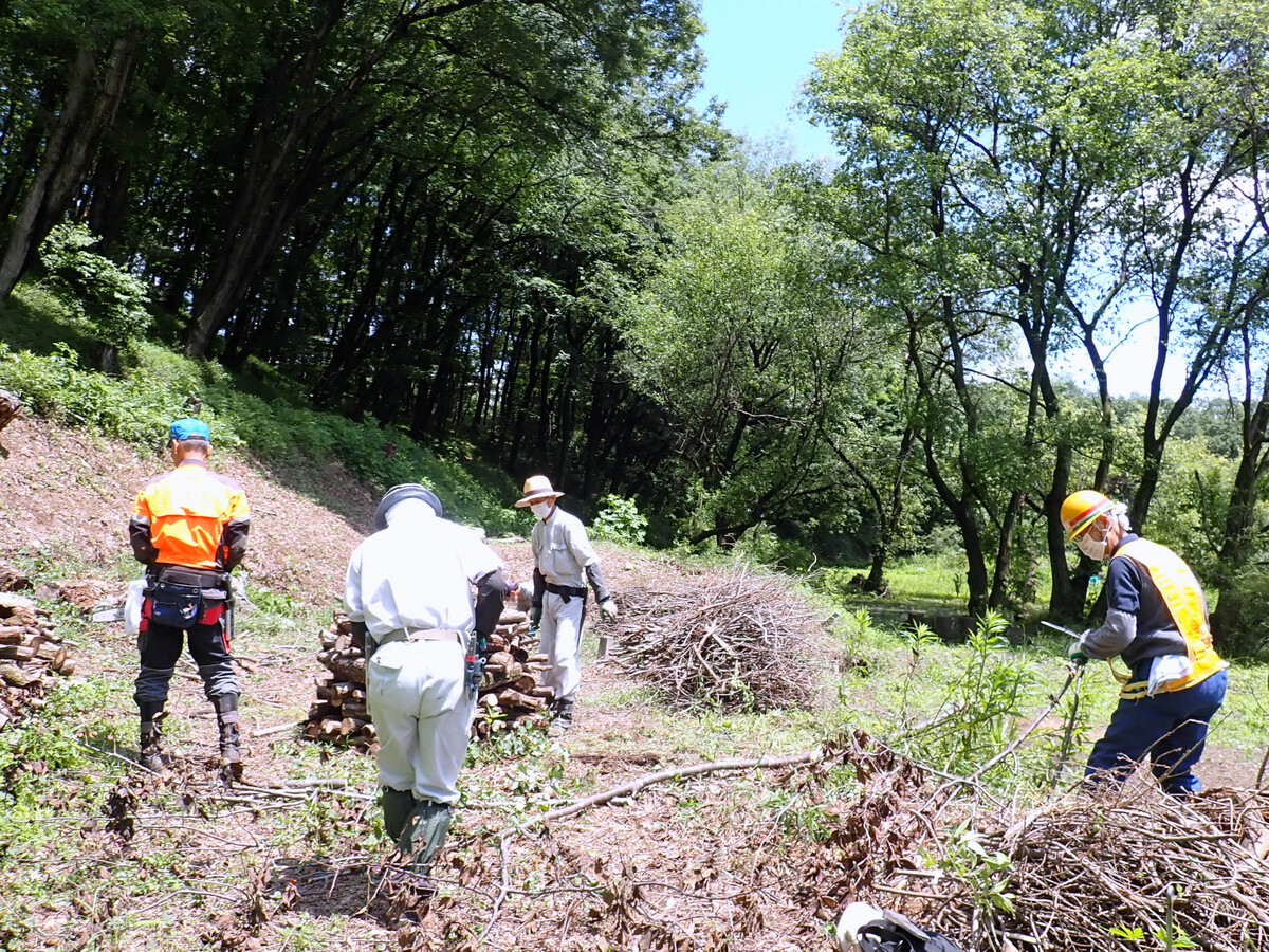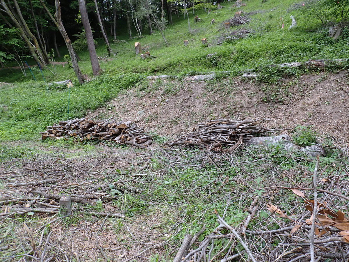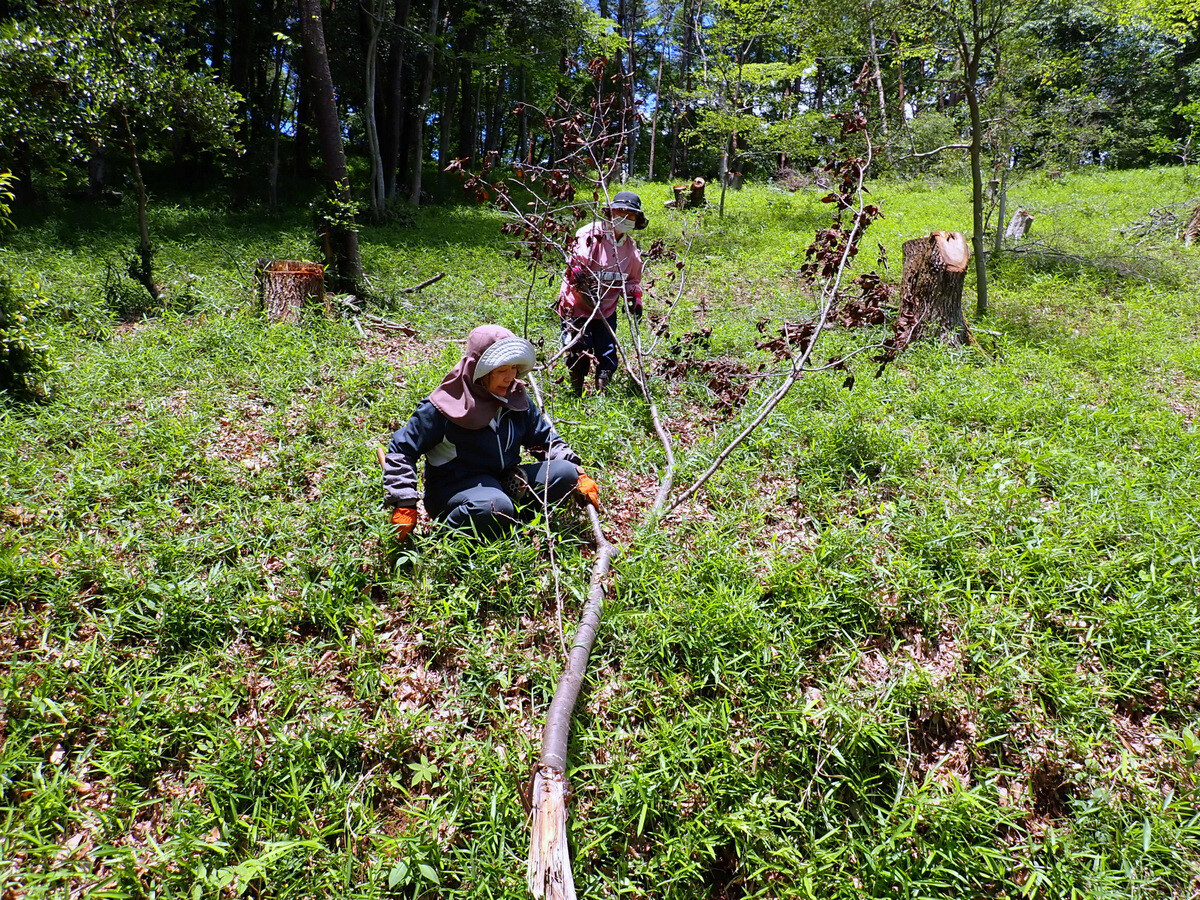 市民の森保全クラブ金曜日の定例活動日(FFF21=Fridays For Forest 21)。参加者は芦田さん、新井さん、澤田さん、木庭さん、鳥取さん、橋本さん、細川さん、鷲巣さん、渡部さん、Hikizineの10名。昨年までに植えたコナラ苗木の周り草刈りと昨年度の伐採・更新エリアの伐採株を切る作業を開始しました。伐倒作業の「最後の仕上げ」(『伐倒造材術』90頁)です。