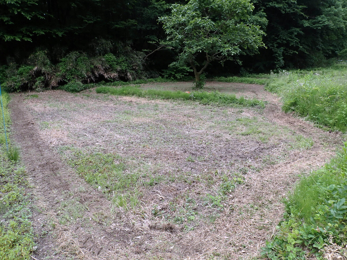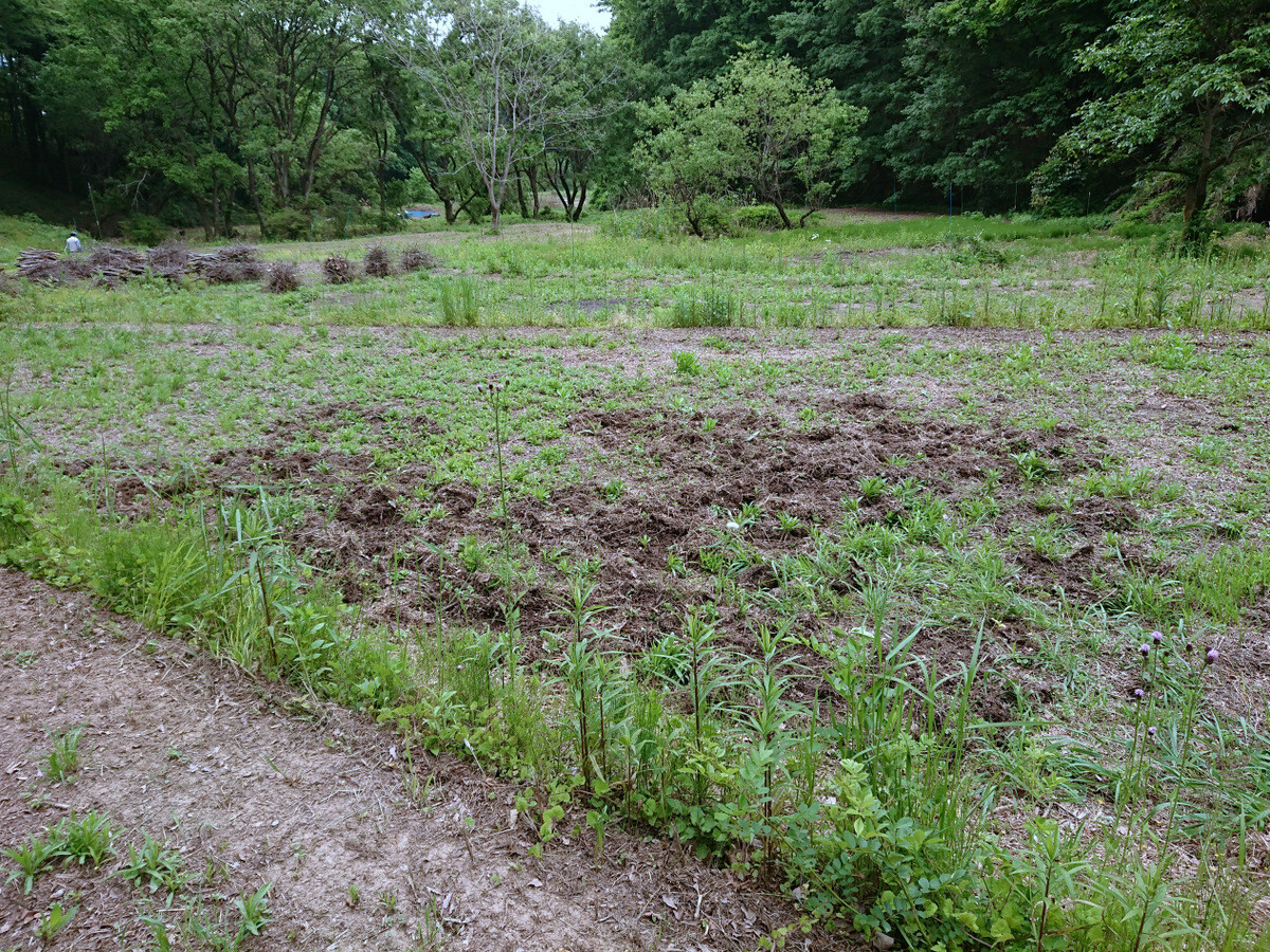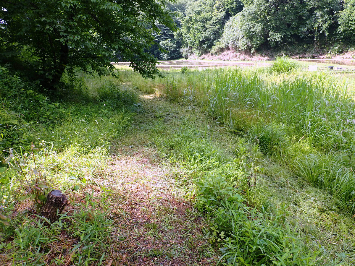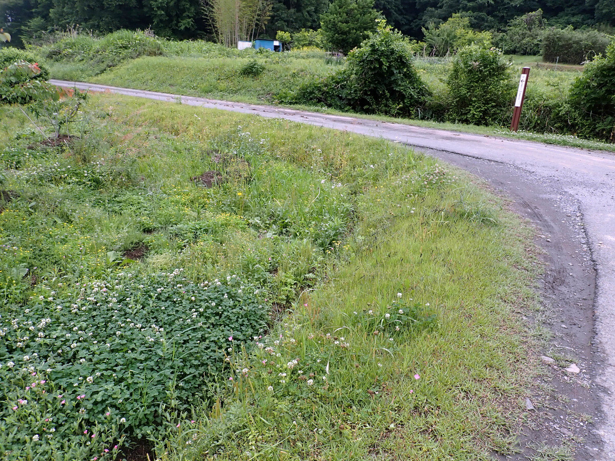 青木ノ入の畑の道端の草刈りをしました。5月中は散策者も多く、ユウゲショウの花を楽しんでいるようでしたので草刈りは延期していましたが、ツボミオオバコが目だってきたので刈りました。東から西に向かっている学びの道が北に向きを変えているカーブです。現在は半分程度がシバ主体になっていますが、草刈りを頻繁に行えば全体がシバになるでしょう。将来的にはここの道端はノシバによる芝地になればと思っています。