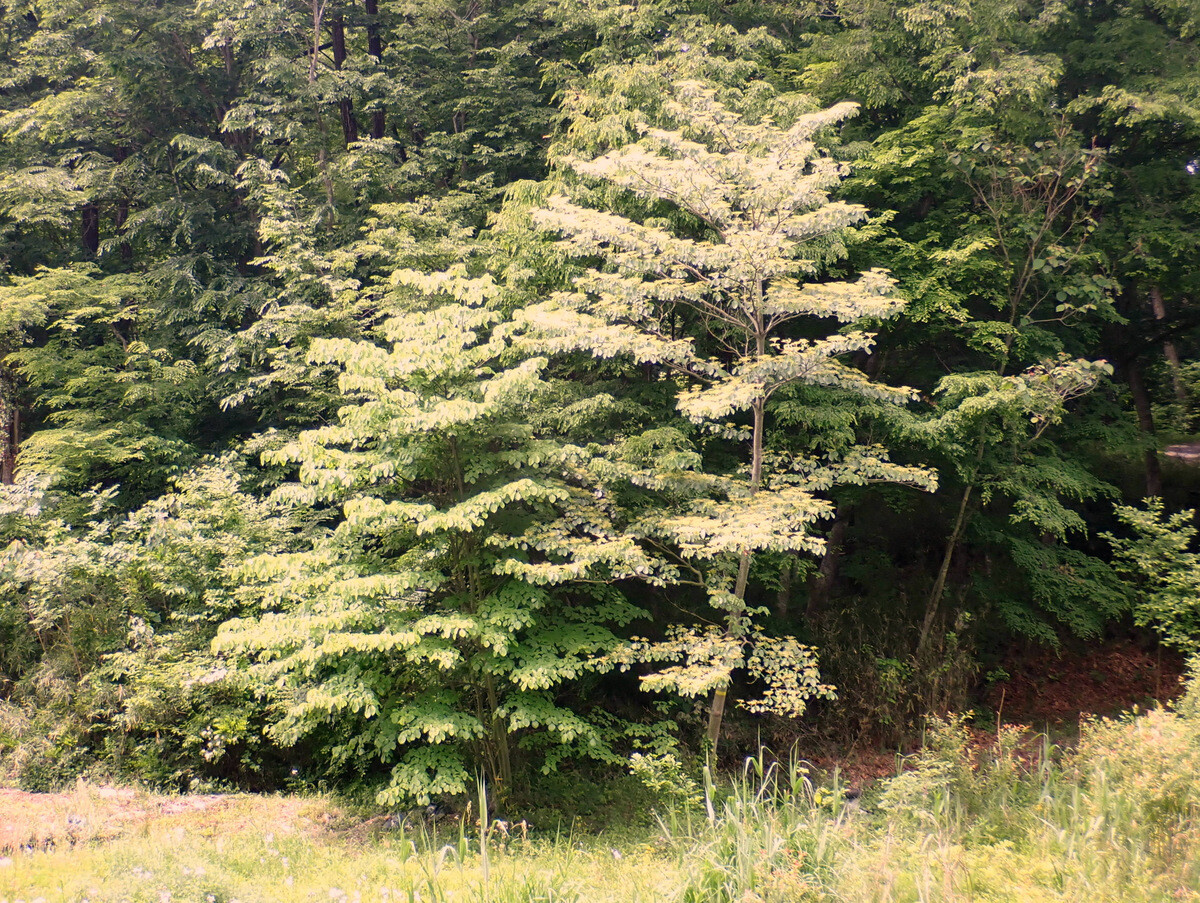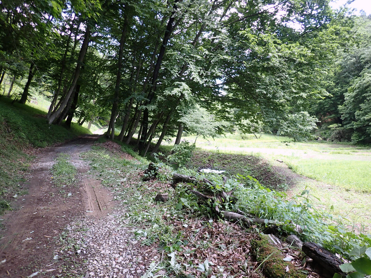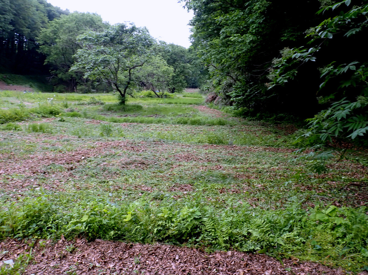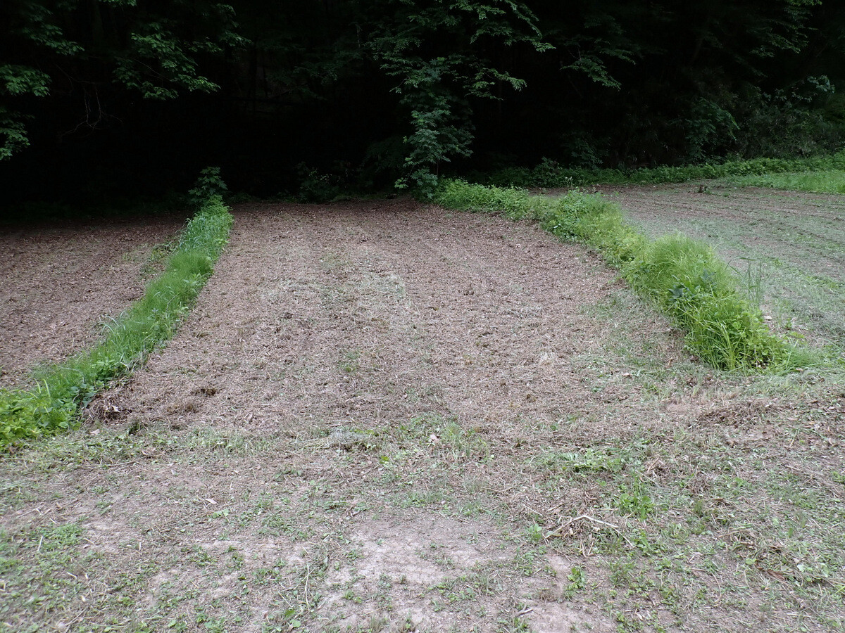 青木ノ入の畑の道端の草刈りをしました。5月中は散策者も多く、ユウゲショウの花を楽しんでいるようでしたので草刈りは延期していましたが、ツボミオオバコが目だってきたので刈りました。東から西に向かっている学びの道が北に向きを変えているカーブです。現在は半分程度がシバ主体になっていますが、草刈りを頻繁に行えば全体がシバになるでしょう。将来的にはここの道端はノシバによる芝地になればと思っています。