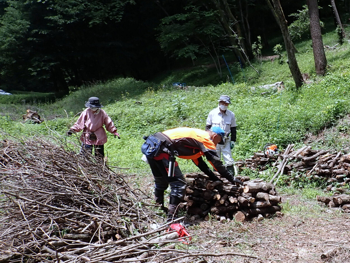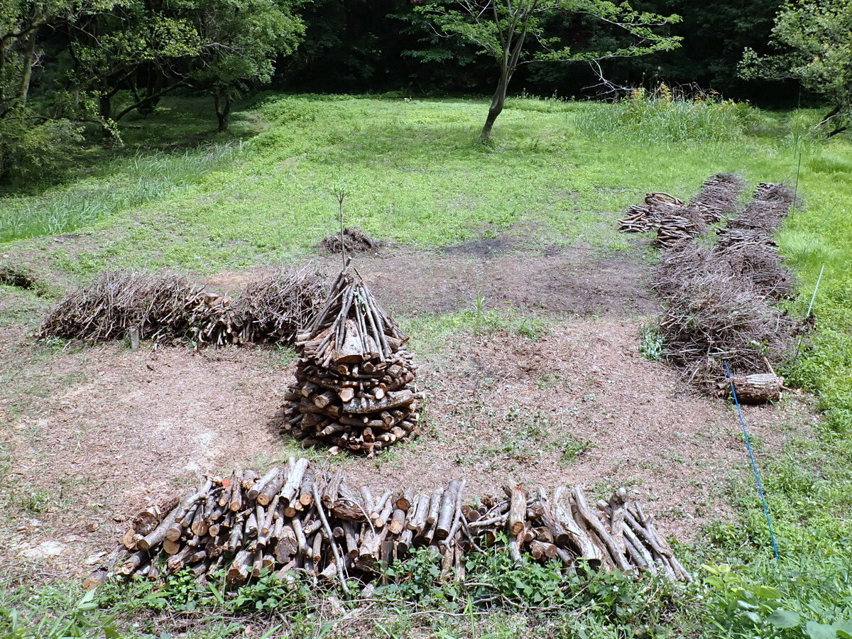 市民の森保全クラブ、日曜日の定例作業日。参加者は芦田さん、片桐さん、金子さん、澤田さん、木庭さん、鳥取さん、細川さん、鷲巣さん、渡部さん、Hikizineの10名。伐採・更新エリアから岩殿F地区に下ろした伐採残材の整理。不揃いの残材をドーナツ状に積み上げるスイス積み(ホルツハウゼン)をして、今日で終了としました。