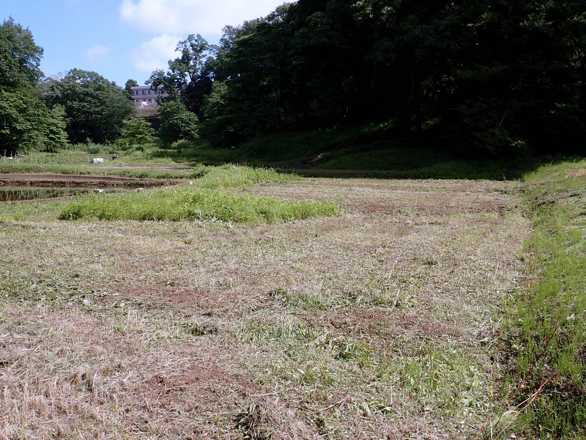 岩殿A地区下の田んぼにシュレーゲルアオガエルの白色の泡に包まれた卵塊が浮いていました。畦の高さがあり畦塗りしていない北側の畦の土中に産卵したものでしょう。シュレーゲルアオガエルは、水田や湿地と樹林地や草地がセットで存在する環境に生息するカエルで、水田の畦や湿地に産卵します。