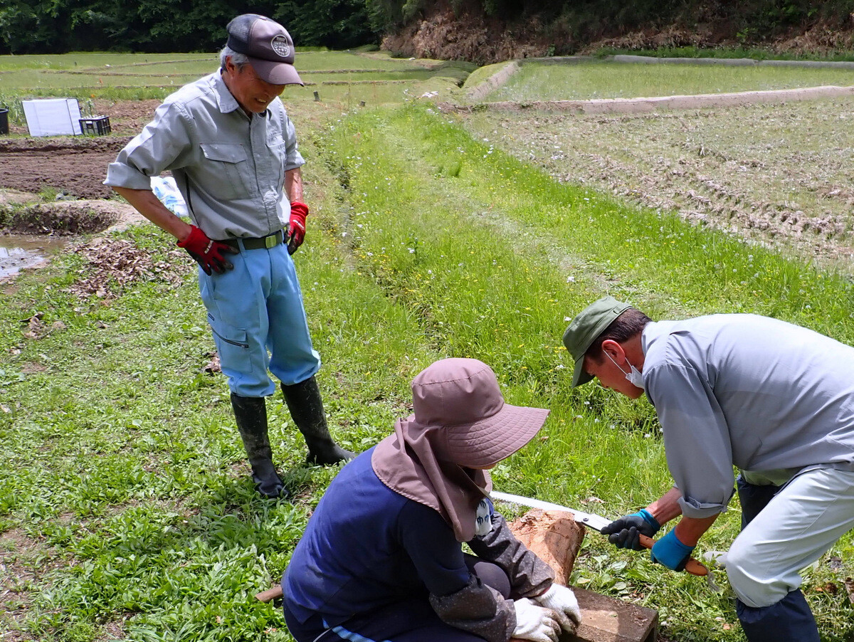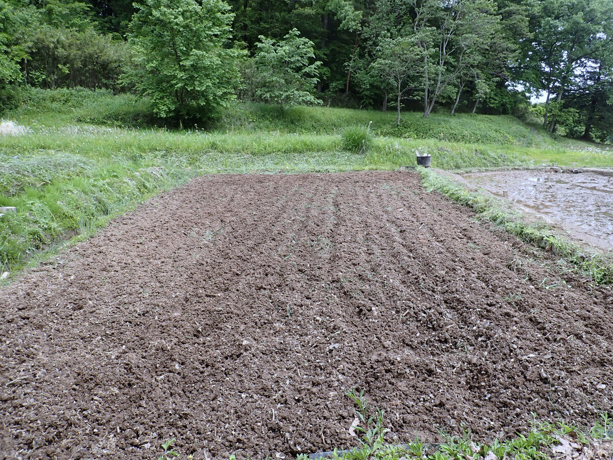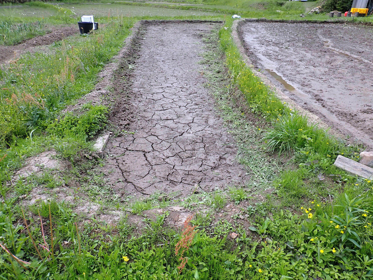 代掻き前にできることはしておくつもりで岩殿A地区下の田んぼの高低を均しました。田植え後の水管理の手間を考えると、田んぼの高低をチェックしてあらかじめ、できるだけ高低差を少なくして均平にしておくことが大切さが分かります。大区画の圃場ではレーザーレベラー、GPSレベラーを使って整地作業を実施しているようですが、小さな谷津田では目測で均すしかありません。