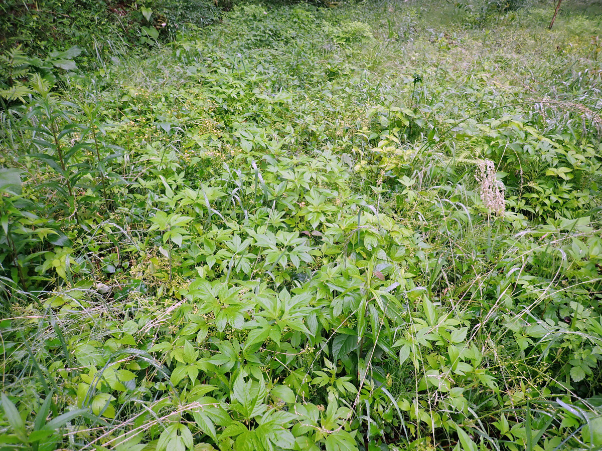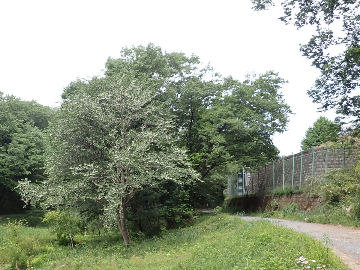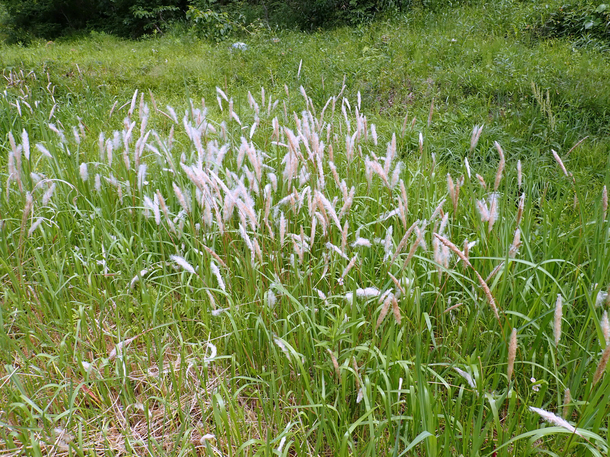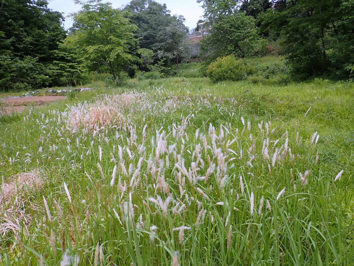 入山沼の余水吐け周辺のオオブタクサが堰堤下の岩殿I地区にも広がってきています。キショウブのようににならないよう、見つけ次第抜き取りましょう。