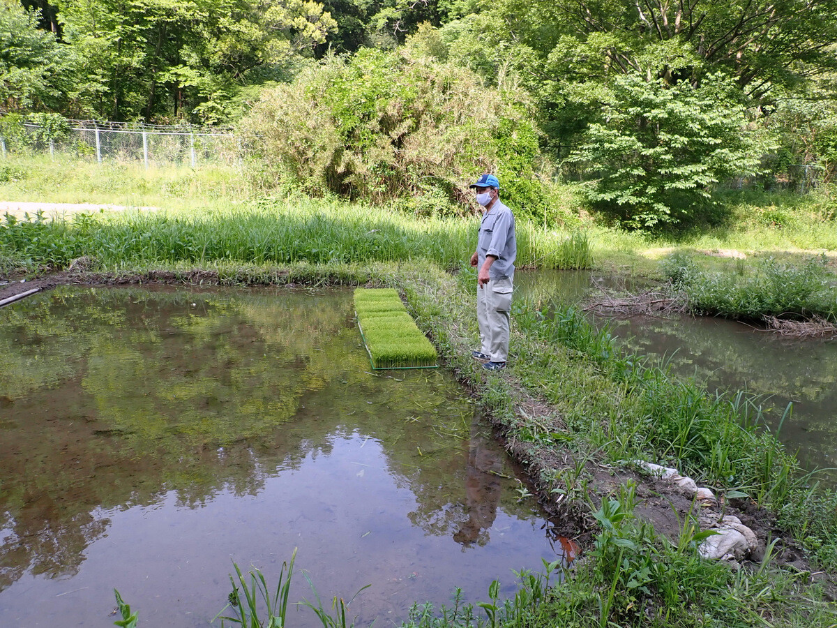 殿山共同農場の高野さんの仲介で吉見町の農家からコシヒカリの苗12箱をいただきました。児沢探検隊の田んぼに置いています。高野さん、平賀さん、探検隊の皆さん、ありがとうございます。