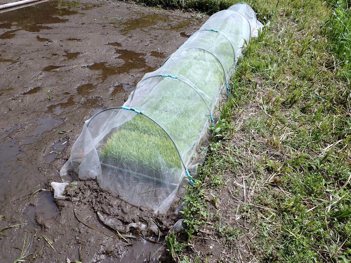 ※田んぼの土をドロドロにして平らに(『山形味の農園』(山形)サイトから 2017.04.28更新記事)
